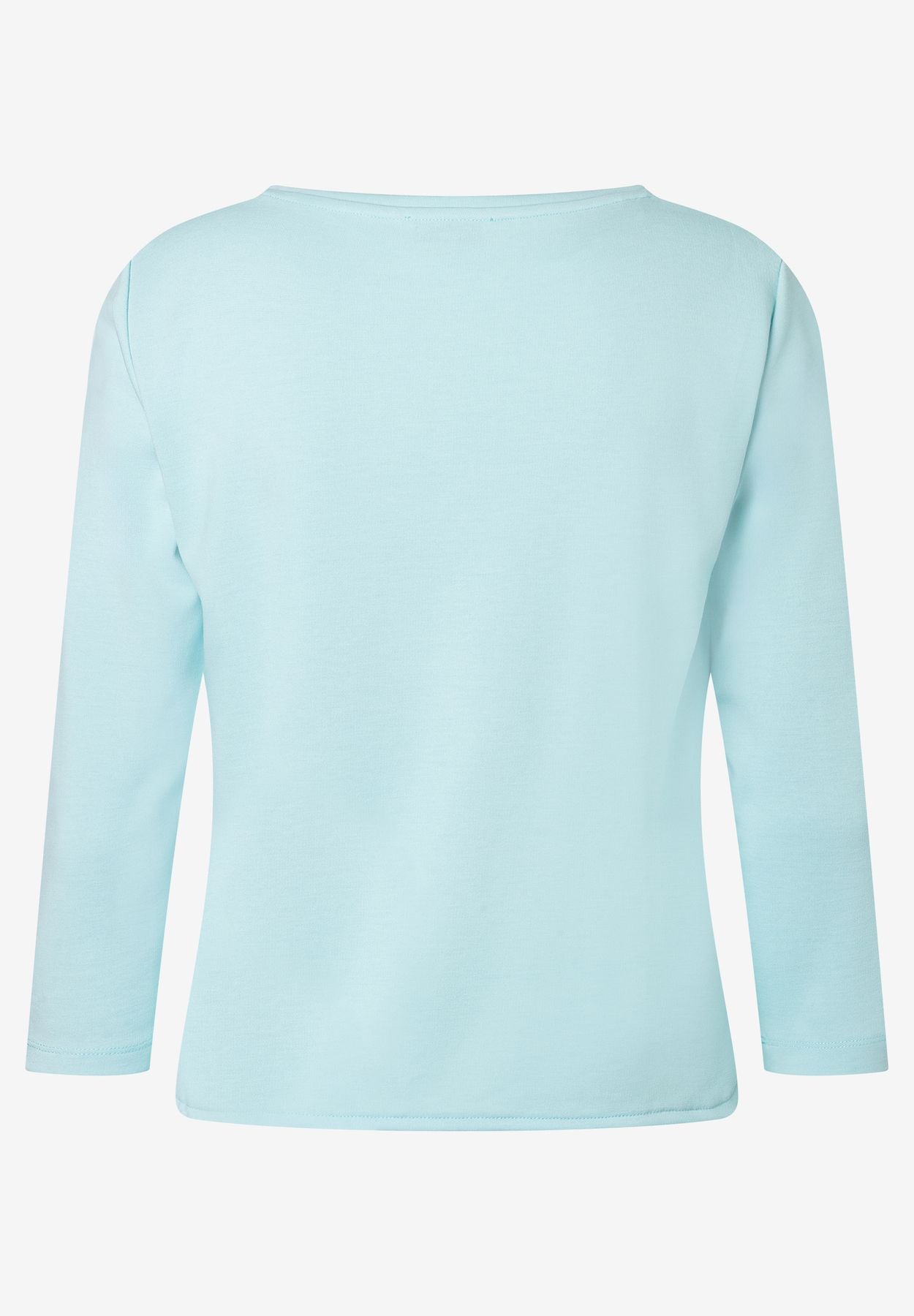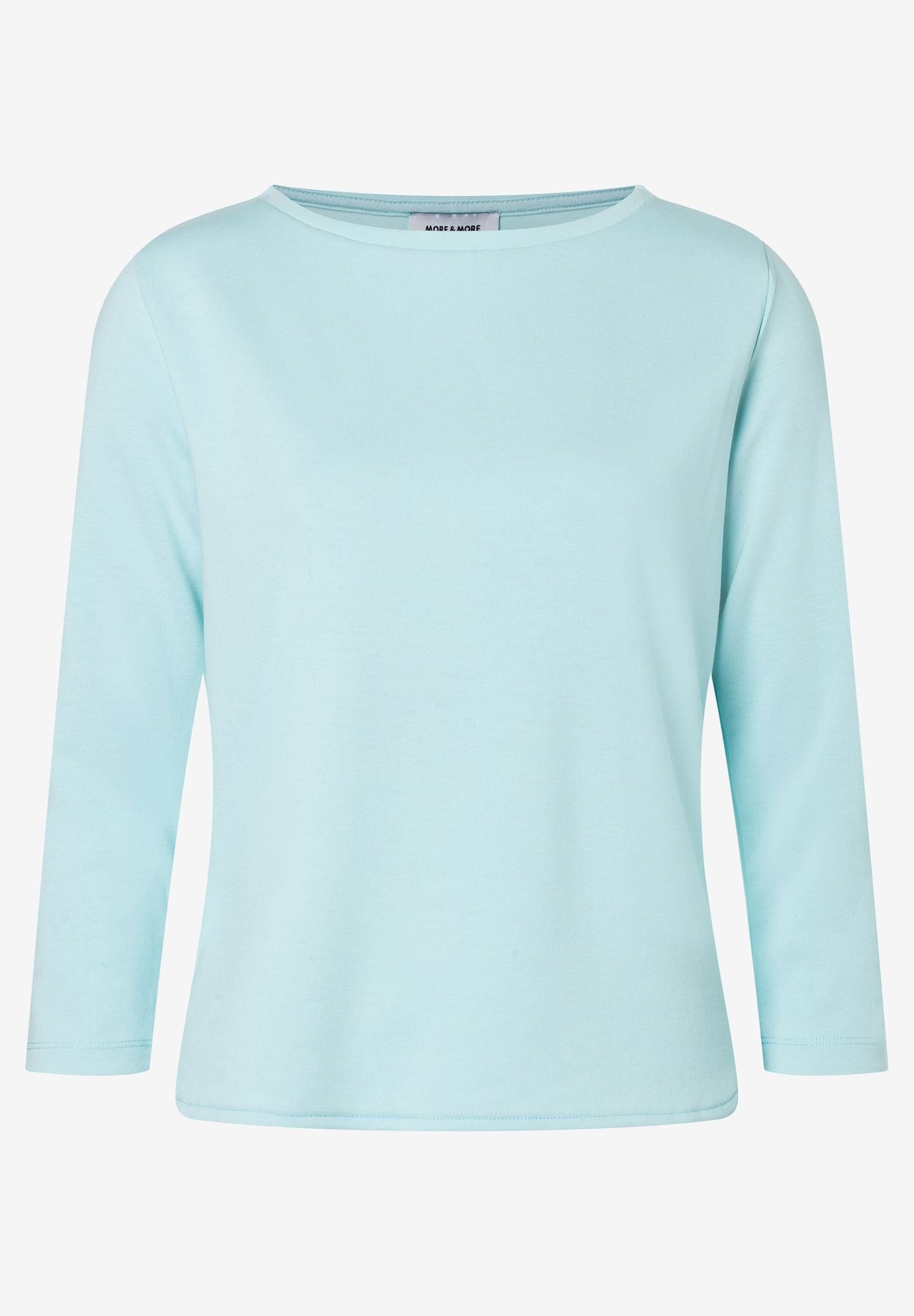 Das mintfarbene T-Shirt von MORE & MORE mit neuem Boxy-Shape sieht zur verwaschenen Jeans sehr l√§ssig aus, funktioniert aber auch im Stilbruch mit klassischem Hosenanzug oder mit femininem Meshrock.