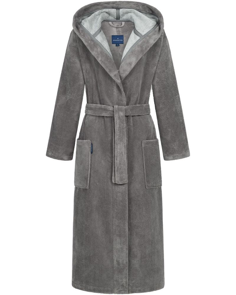 Hochwertiger Damen Bademantel mit sportlicher Kapuze mit Testnote "Sehr Gut" für Hautsensorik (Hohenstein Institute Label Geprüftes Wellnesstextil Prüfnummer HL 15.1.11.0364) zertifiziert. Die Außenseite besteht aus feinem Microfaser-Velours. Innen befinden sich saugstarke Frotteeschlingen aus Bambus/Baumwolle. Der Mantel hat auf der Vorderseite zwei aufgesetzte größere Taschen und ist damit auch für die Aufbewahrung größerer Smartphones geeignet. Der Mantel wird mit einem Gürtel gebunden. Der runde Rückeninnenbeleg ist sehr wertig verarbeitet. Das Material ist sehr weich und anschmiegsam und hat eine hervorragende Feuchtigkeitsaufnahme. Mit praktischer extra Reißverschluss Innentasche. Material 40% Polyester (Microfaser), 30% Baumwolle, 30% Viskose (Bambus). Rückenlänge: 120 cm