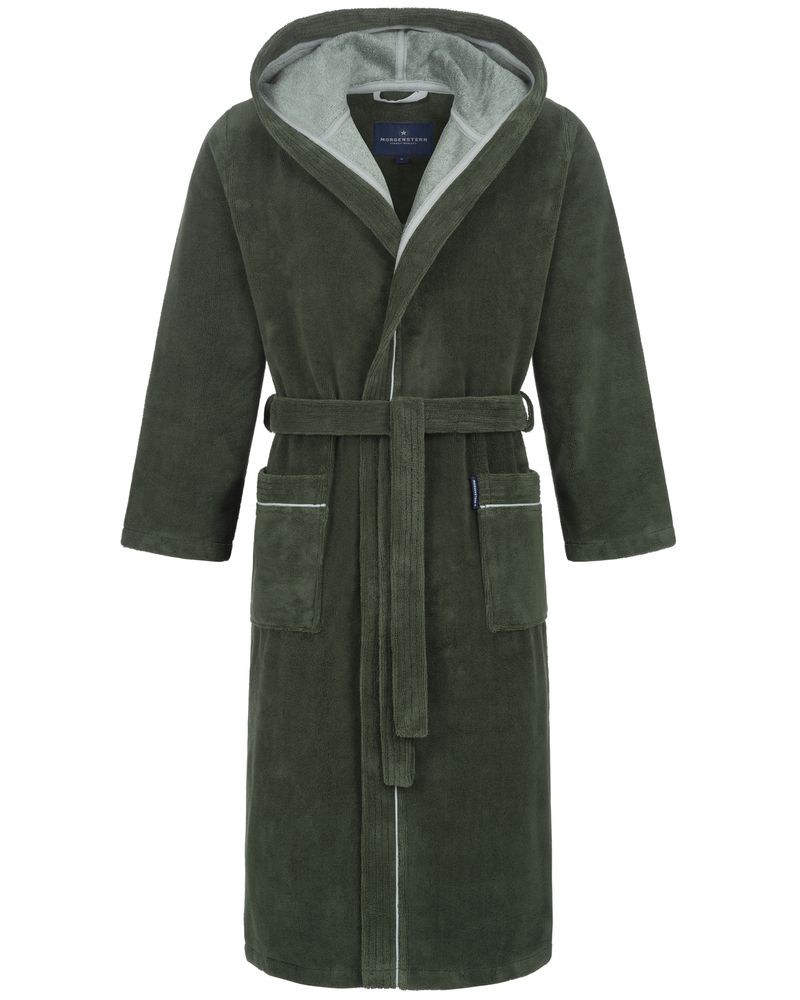Hochwertiger Kapuzenbademantel mit feinen Biesen und edler 4-fach Absteppung am Revers und an den Taschenkanten. Der Mantel zeichnet sich durch einen hohen Tragekomfort aus und ist zertifiziert als geprüftes Welllnextextil mit der Testnote "Sehr Gut" für Hautsensorik (Hohenstein Institute Prüfnummer HL 15.1.11.0364). Auf der Vorderseite befinden sich zwei aufgesetzte Taschen. Eine Tasche hat eine extra Reißverschluss Innentasche. Die Außenseite besteht aus feinem Microfaser-Velours. Auf der Innenseite befinden sich saugstarke Frotteeschlingen aus Bambus/Baumwolle. Neben der ausgezeichneten Qualität überzeugt der Mantel durch eine besondere Farbgebung. Der Mantel ist farblich mit Biesen und einer anderen Innenfarbe abgesetzt. Material: 40% Polyester (Microfaser), 30% Baumwolle, 30% Viskose (Bambus). Rückenlänge: 121-129 cm