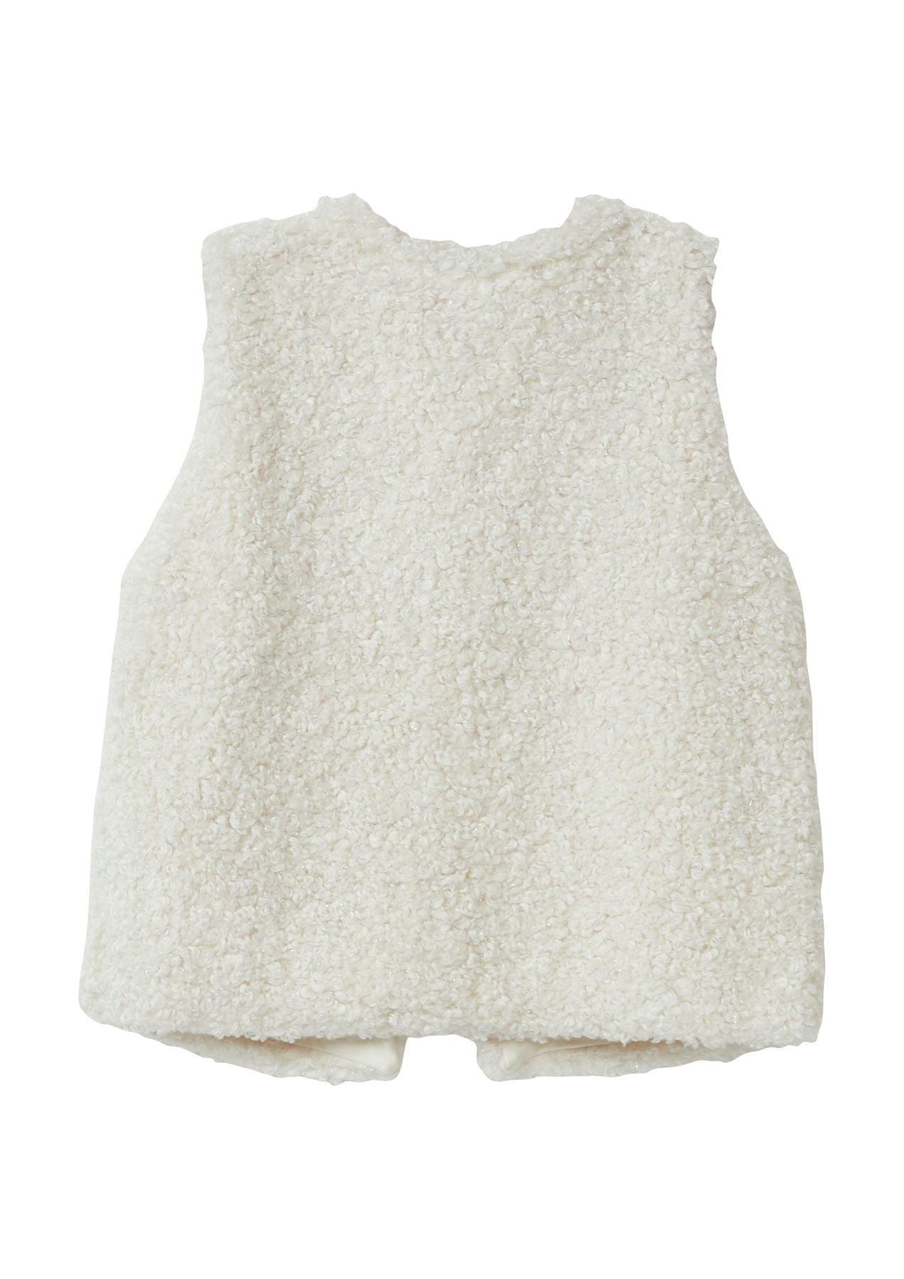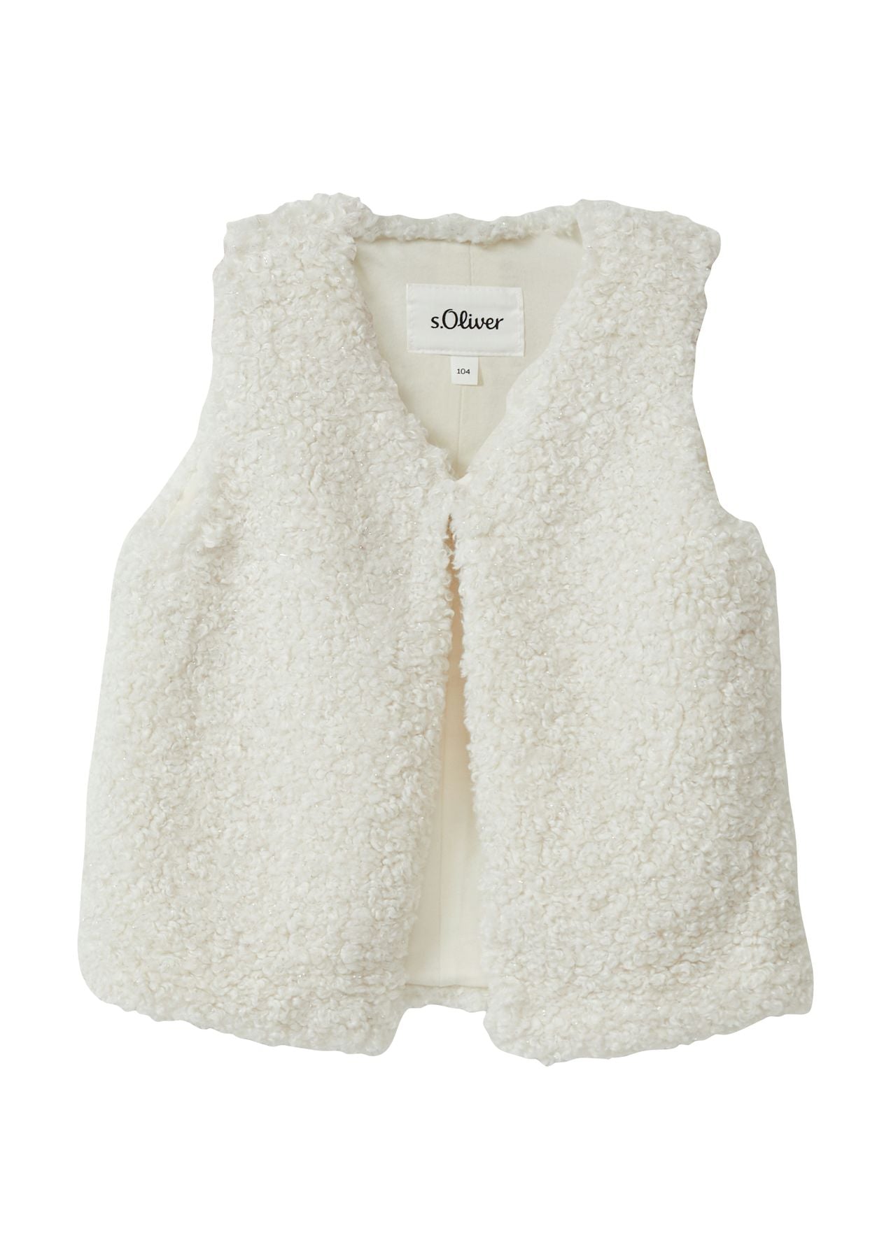 Kuschelige Weste aus Teddy-Plüsch mit Glitzereffekt für dein Kind. Der weiche Stoff mit Baumwollfutter hält warm und sorgt für Behaglichkeit. Der V-Ausschnitt und der praktische Haken-Ösen-Verschluss erleichtern das An- und Ausziehen. Ein glitzernder Begleiter für kalte Tage und festliche Anlässe.