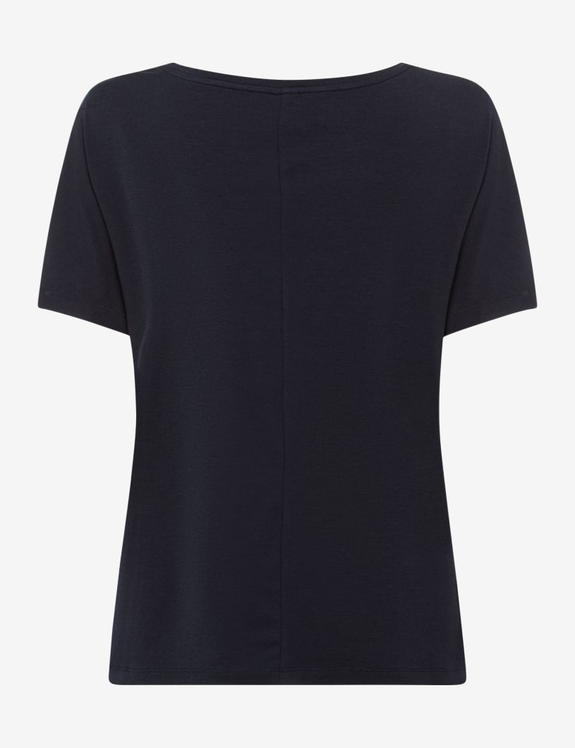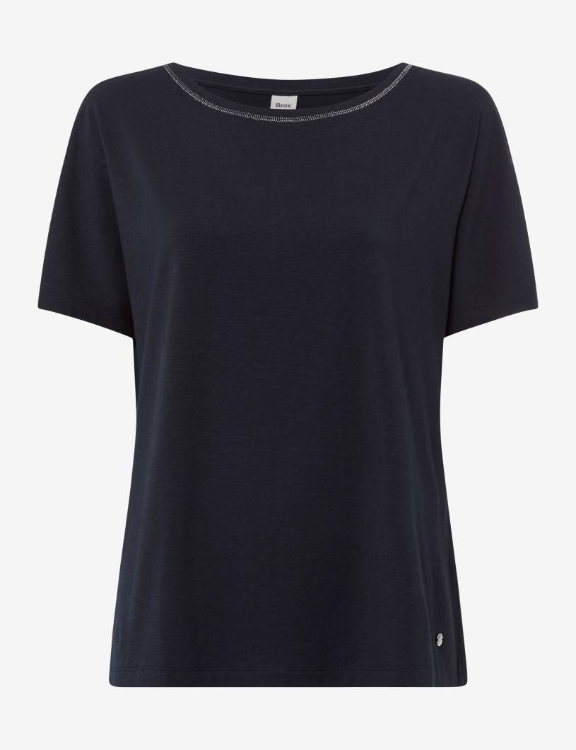 Das T-Shirt im STYLE CAELEN S verbindet mühelos Stil mit Wohlfühlkomfort. Mit seiner lockeren Silhouette und den überschnittenen Schultern strahlt es eine lässige Eleganz aus, die durch die entspannte Passform unterstrichen wird. Der klassische Rundhalsausschnitt wird durch zarte Lurexfäden veredelt, die dem Design einen dezenten Hauch von Glamour verleihen und das schlichte Erscheinungsbild mit einem feinen Detail abrunden. Gefertigt aus einem hochwertigen Mix aus Baumwolle, Modal und Elasthan, bietet dieses Oberteil eine optimale Kombination aus natürlicher Atmungsaktivität, weichem Griff und elastischem Tragekomfort. Der geschmeidige Modalanteil sorgt für eine luxuriöse Haptik, während der Elasthan für eine perfekte Passform und Bewegungsfreiheit sorgt. Dieses Jersey-Shirt mit seinem lockeren Schnitt ist ideal für entspannte Freizeitlooks, da es sich angenehm auf der Haut trägt und gleichzeitig durch die LOOSE-FIT-Passform maximale Bequemlichkeit garantiert. Farbe