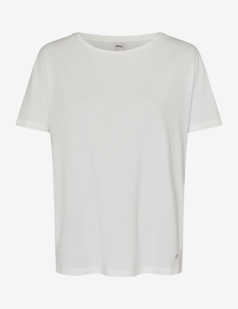 Das T-Shirt im STYLE CAELEN S verbindet mühelos Stil mit Wohlfühlkomfort. Mit seiner lockeren Silhouette und den überschnittenen Schultern strahlt es eine lässige Eleganz aus, die durch die entspannte Passform unterstrichen wird. Der klassische Rundhalsausschnitt wird durch zarte Lurexfäden veredelt, die dem Design einen dezenten Hauch von Glamour verleihen und das schlichte Erscheinungsbild mit einem feinen Detail abrunden. Gefertigt aus einem hochwertigen Mix aus Baumwolle, Modal und Elasthan, bietet dieses Oberteil eine optimale Kombination aus natürlicher Atmungsaktivität, weichem Griff und elastischem Tragekomfort. Der geschmeidige Modalanteil sorgt für eine luxuriöse Haptik, während der Elasthan für eine perfekte Passform und Bewegungsfreiheit sorgt. Dieses Jersey-Shirt mit seinem lockeren Schnitt ist ideal für entspannte Freizeitlooks, da es sich angenehm auf der Haut trägt und gleichzeitig durch die LOOSE-FIT-Passform maximale Bequemlichkeit garantiert.