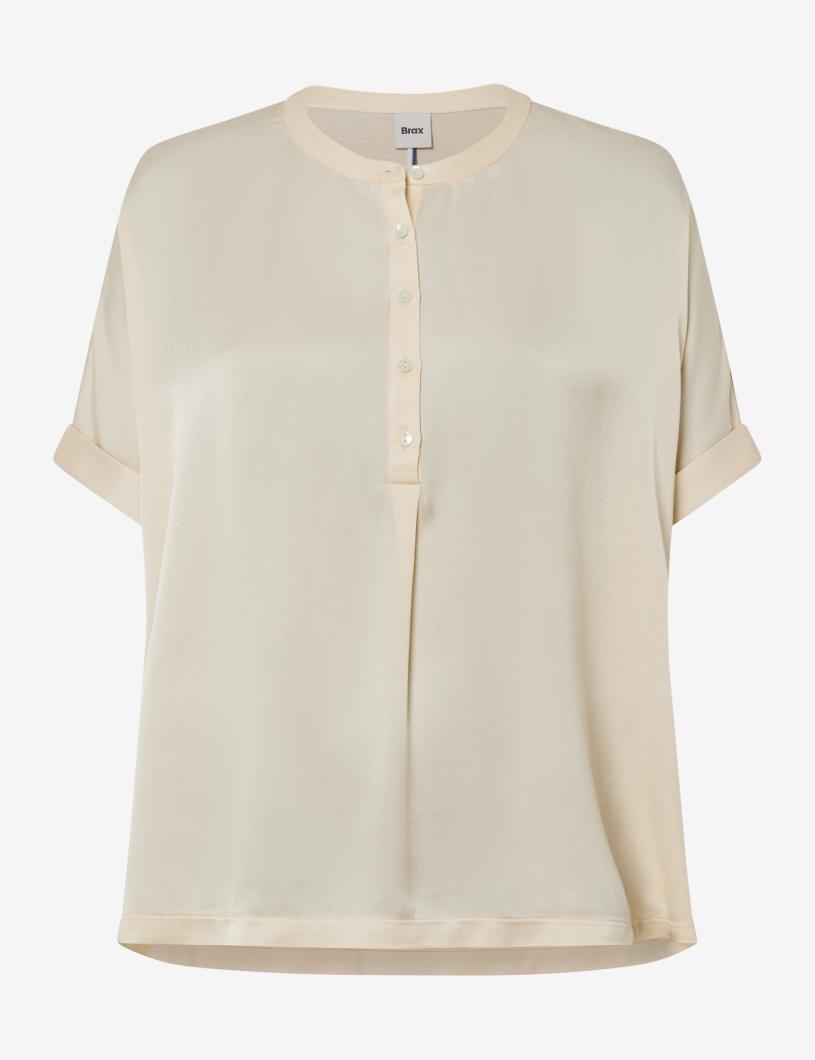 Ein feminines Essential mit moderner Leichtigkeit – das Hybridshirt für Damen im Style Claire.S verleiht schlichten Looks ein elegantes Finish.. Der entspannte Schnitt mit überschnittenen Schultern, angeschnittenen Ärmeln und einer kurzen Knopfleiste verleiht dem Look eine unaufgeregte Struktur. Dezente Details wie der schmale Rundhalsausschnitt und die fixierten Ärmelaufschläge unterstreichen den minimalistischen Stil und machen das Shirt zu einem vielseitigen Begleiter für Büro, Freizeit oder gepflegte Casual-Outfits. Die fließende Vorderseite bringt eine feminine Note ins Spiel und sorgt für eine sanfte, elegante Silhouette. Im Kontrast dazu steht das Rückenteil, das bewusst auf Bewegungsfreiheit und Tragekomfort setzt – eine Kombination, die nicht nur optisch harmoniert, sondern sich auch angenehm auf der Haut anfühlt. Gefertigt ist das Vorderteil aus hochwertiger Viskose mit geschmeidigem Fall, während die Rückseite aus softem Jersey besteht, der für eine flexible Passform sorgt.