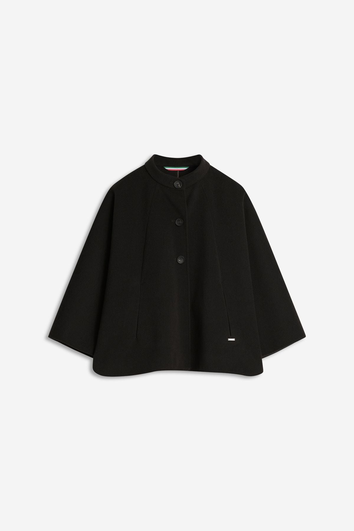 Moderne Kurzjacke mit klarer Linie und charakterstarkem Design. Der hohe Stehkragen, die überschnittene Schulter und die weite, kastige Form sorgen für eine reduzierte, aber dennoch ausdrucksstarke Optik.