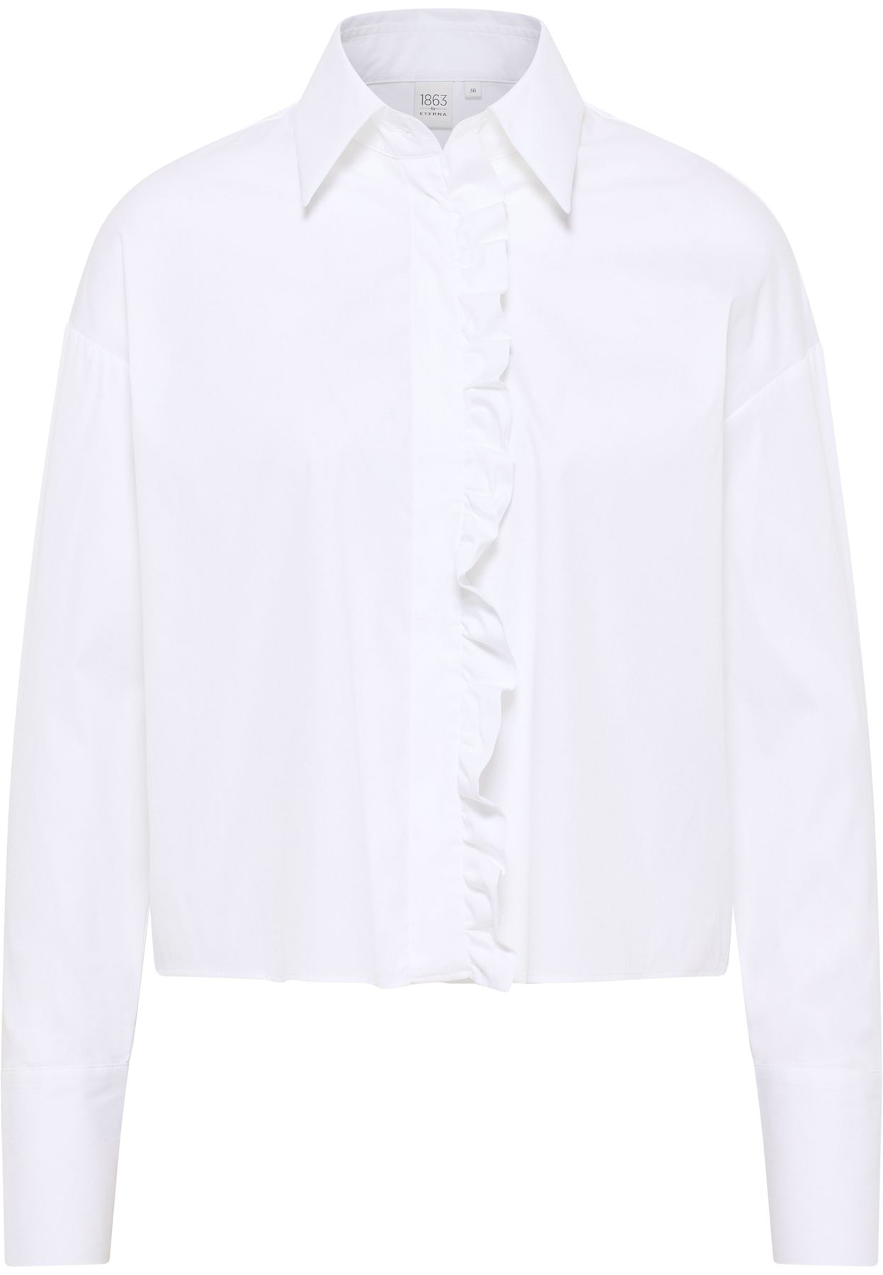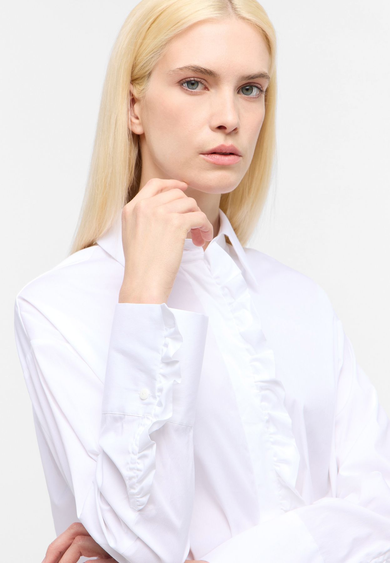 Ein besonderer Eyecatcher an dieser Premium-Bluse sind die verspielten Rüschen an der verdeckten Knopfleiste und an den Manschetten.
