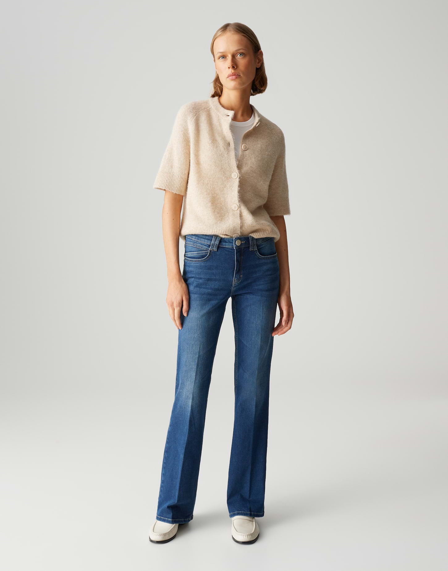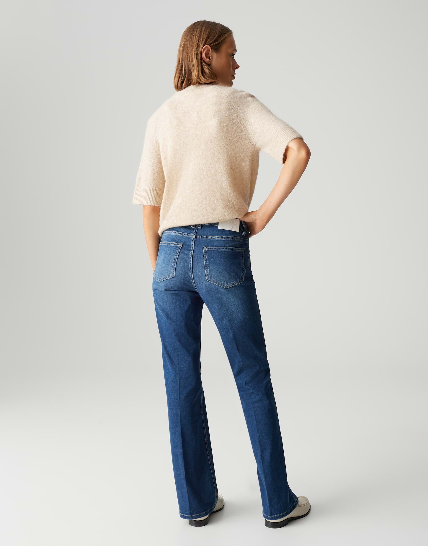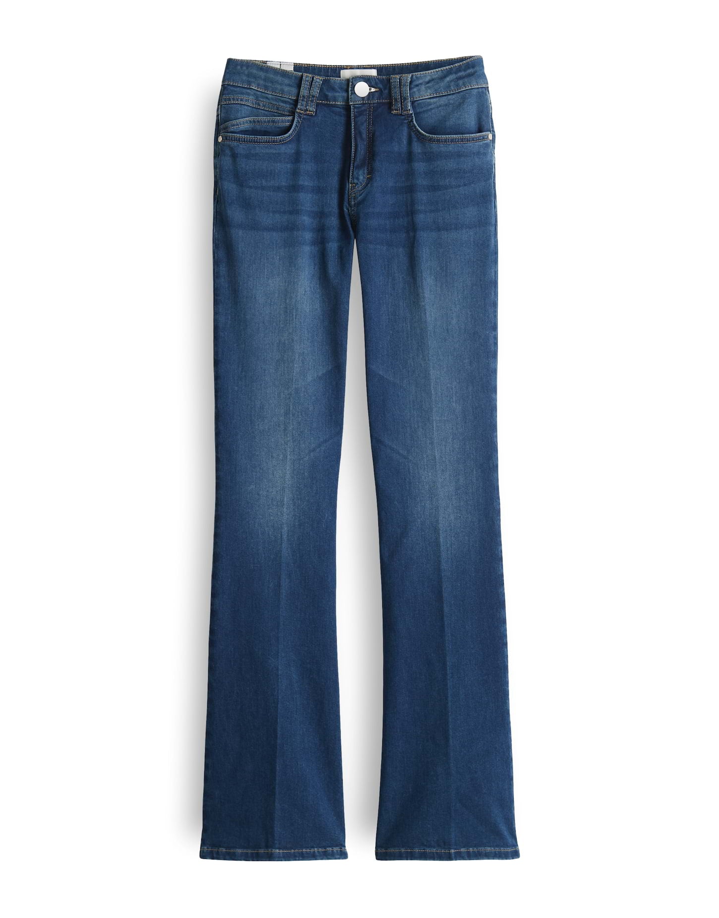 schmal am Oberschenkel, ausgestelltes Bein, Hosenbein Innenlänge ca. 81 cm in jeder Größe, Model Größe 178 cm – trägt Größe 36, Denim, weicher Griff, authentische Waschung, Eingrifftaschen vorne, aufgesetzte Taschen hinten, Bügelfalten, Zip-Fly, leichte Used-Effekte, Crinkle-Effekte