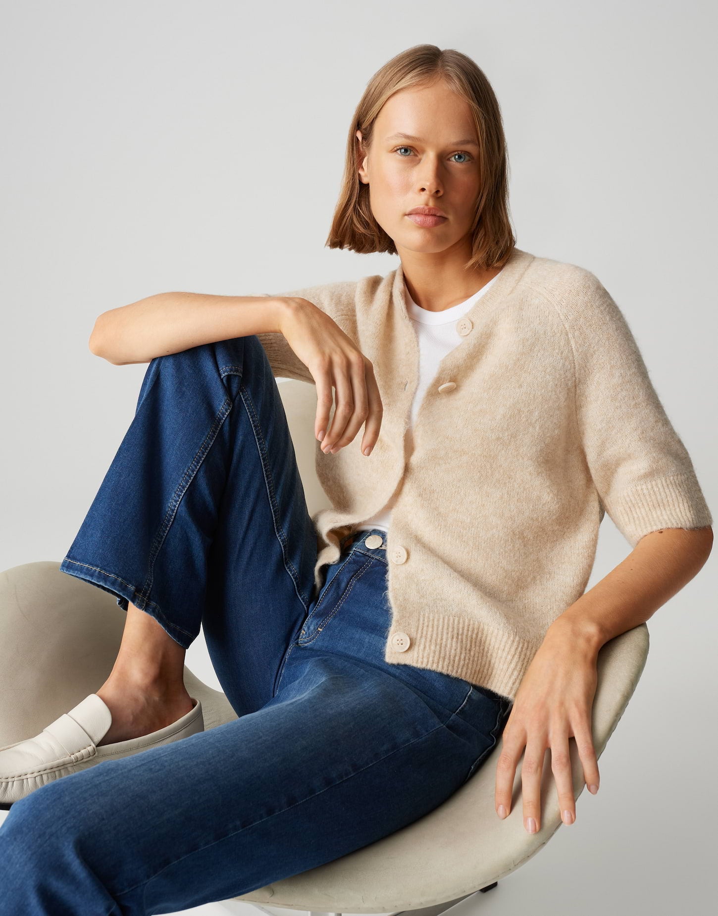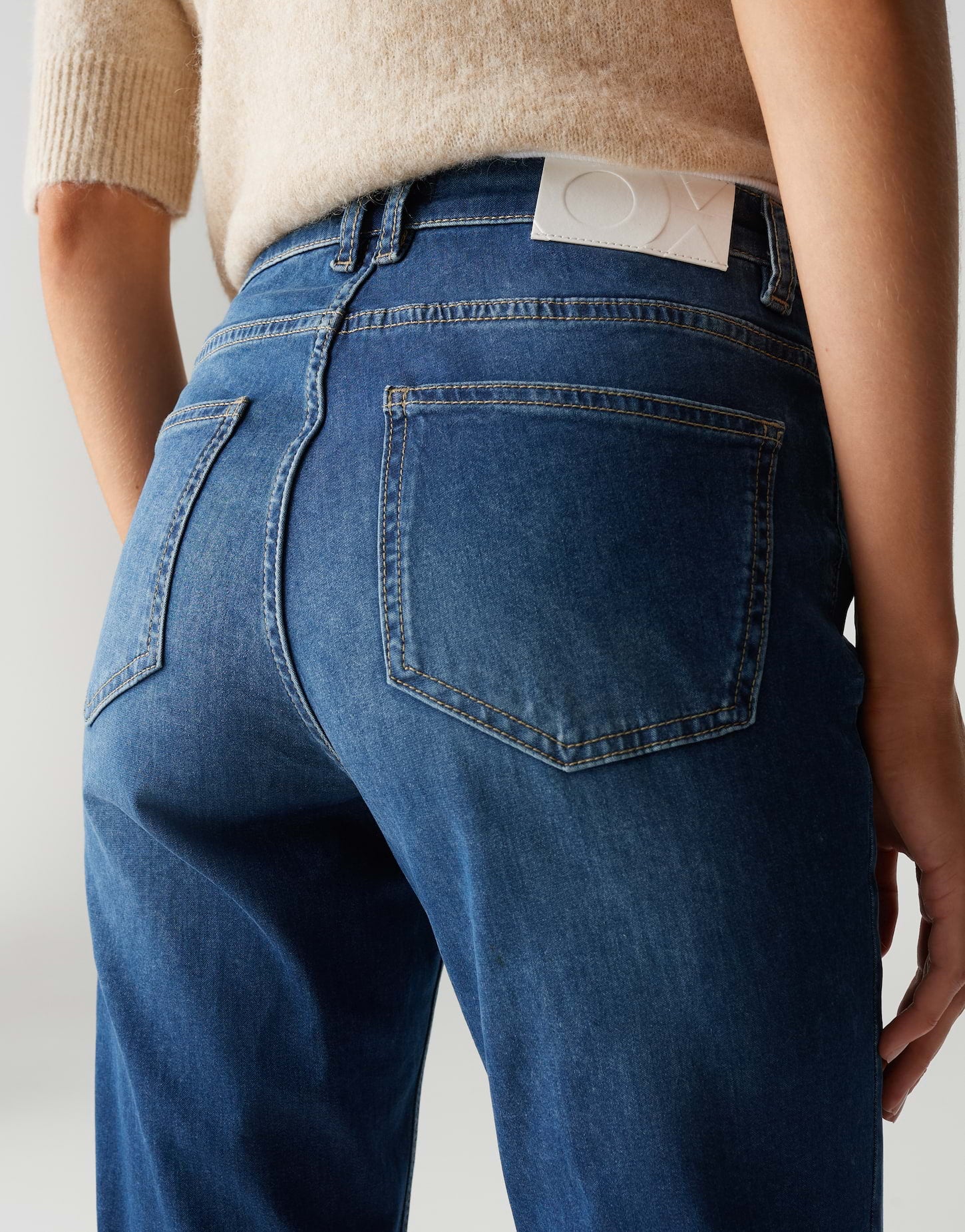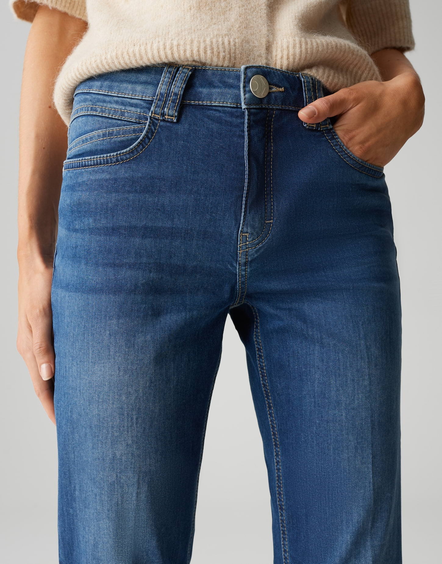 schmal am Oberschenkel, ausgestelltes Bein, Hosenbein Innenlänge ca. 81 cm in jeder Größe, Model Größe 178 cm – trägt Größe 36, Denim, weicher Griff, authentische Waschung, Eingrifftaschen vorne, aufgesetzte Taschen hinten, Bügelfalten, Zip-Fly, leichte Used-Effekte, Crinkle-Effekte