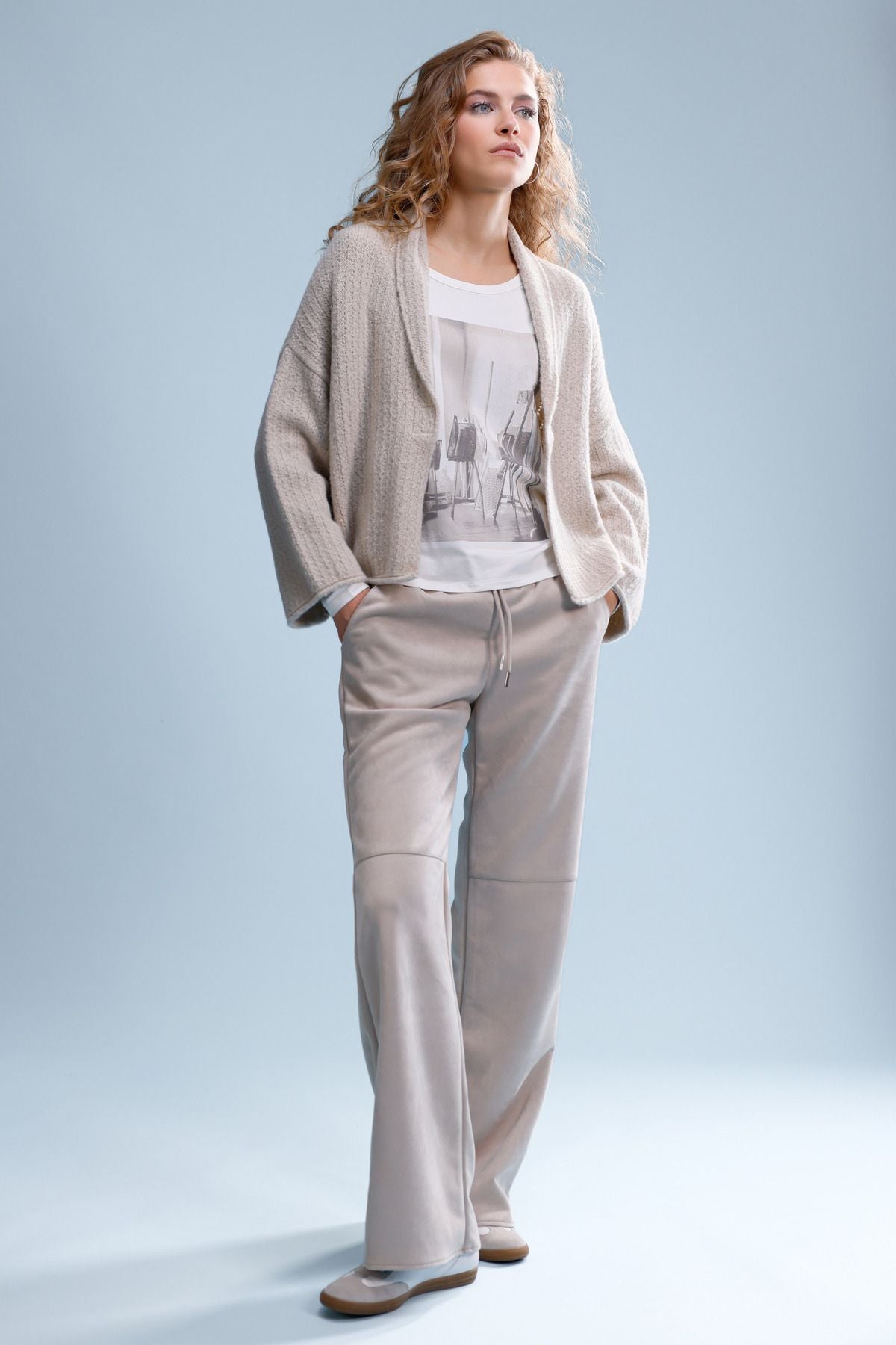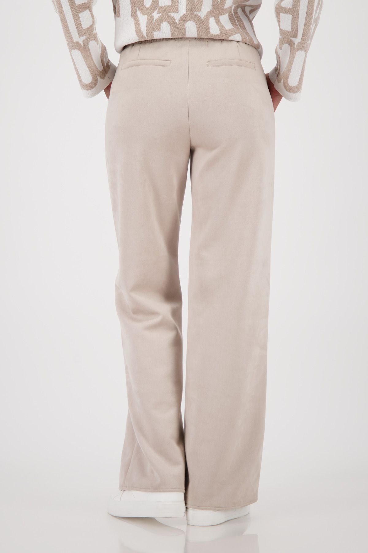 Entdecken Sie die stilvolle Straight-Leg-Velour-Hose aus einem elastischen Material mit elastischem Bund, seitlichen Taschen und modernen Fake-Gesäßtaschen.