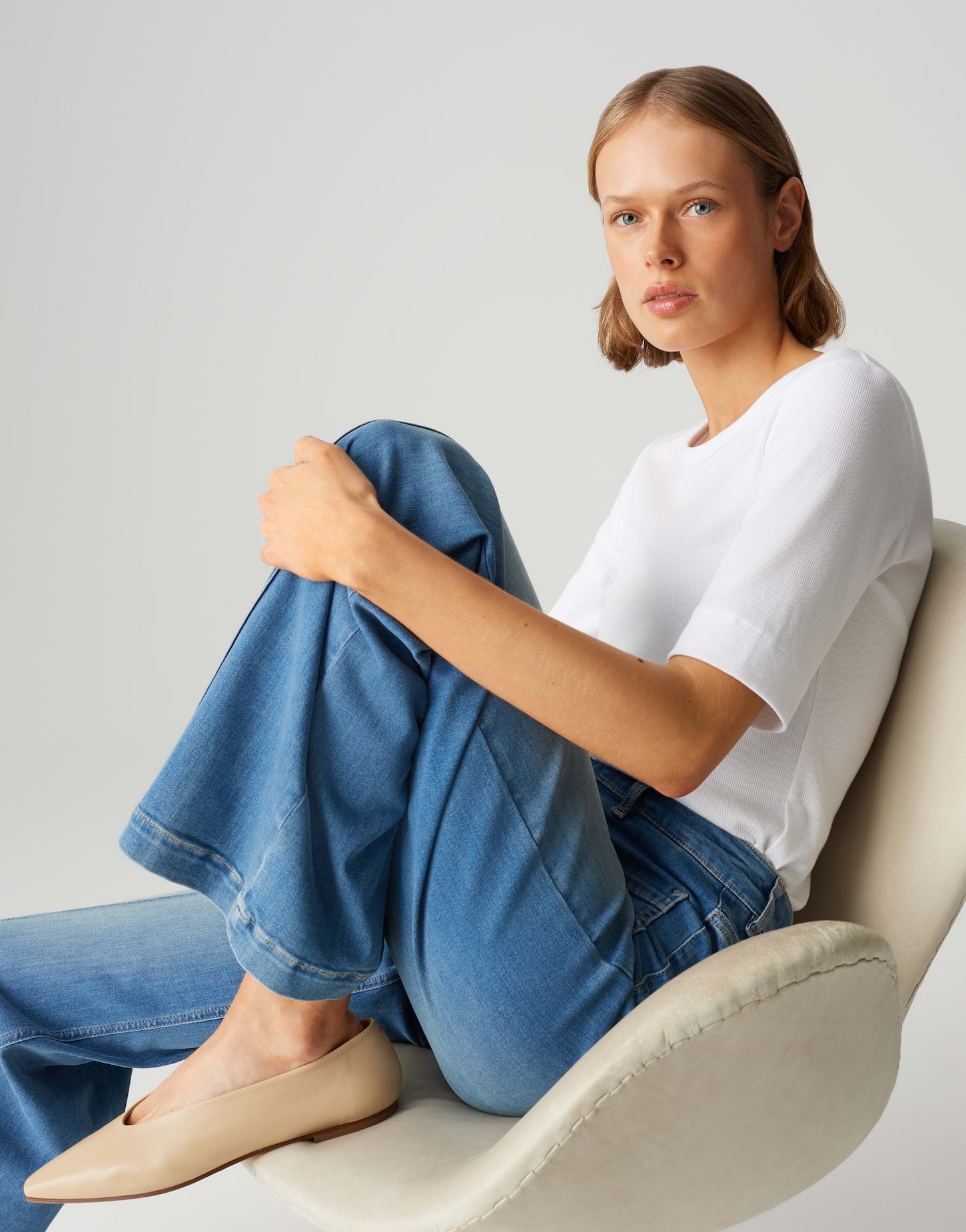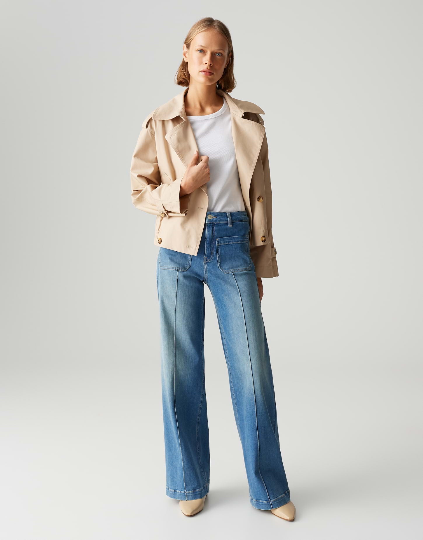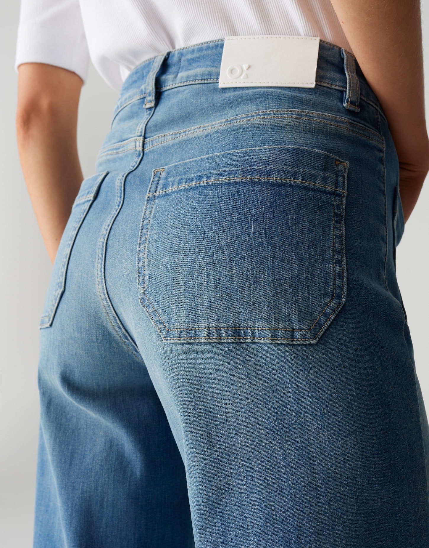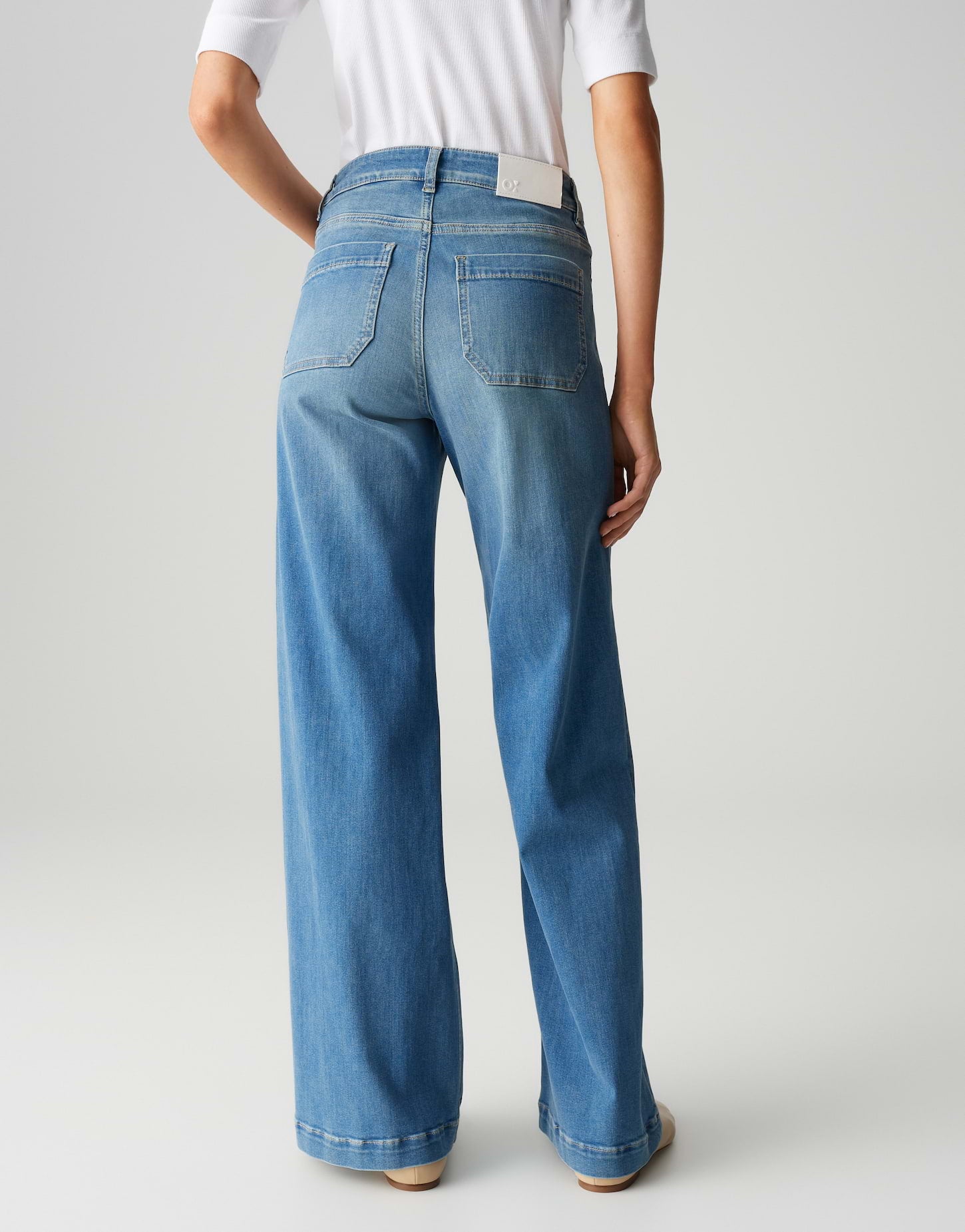weiter Beinverlauf, weit am Oberschenkel, Hosenbein Innenlänge ca. 82 cm in jeder Größe, Model Größe 178 cm – trägt Größe 36, Denim, weicher Griff, authentische Waschung, aufgesetzte Taschen vorne, große Gesäßtaschen, abgesteppte Biesen vorne, Zip-Fly, leichte Used-Effekte, Crinkle-Effekte
