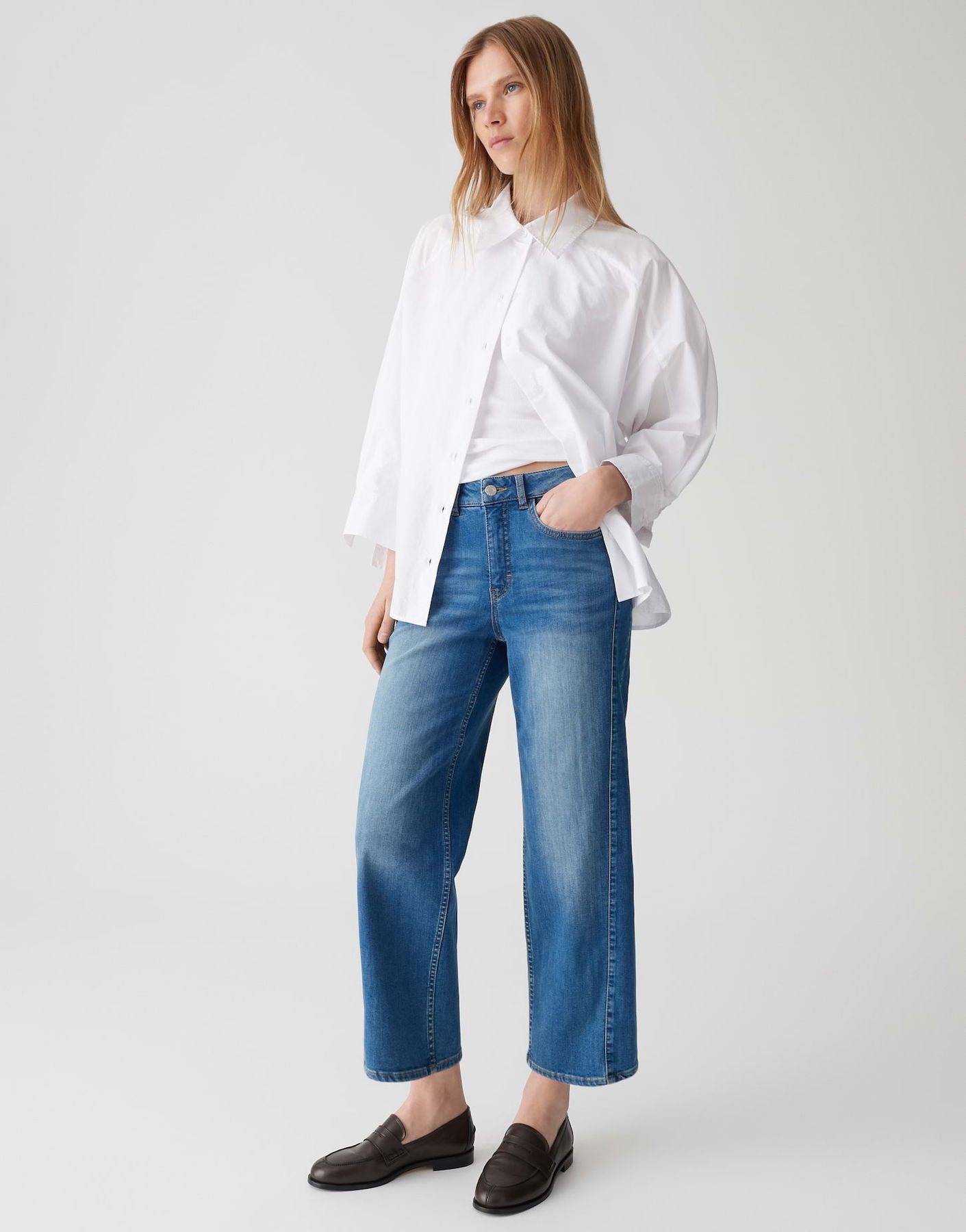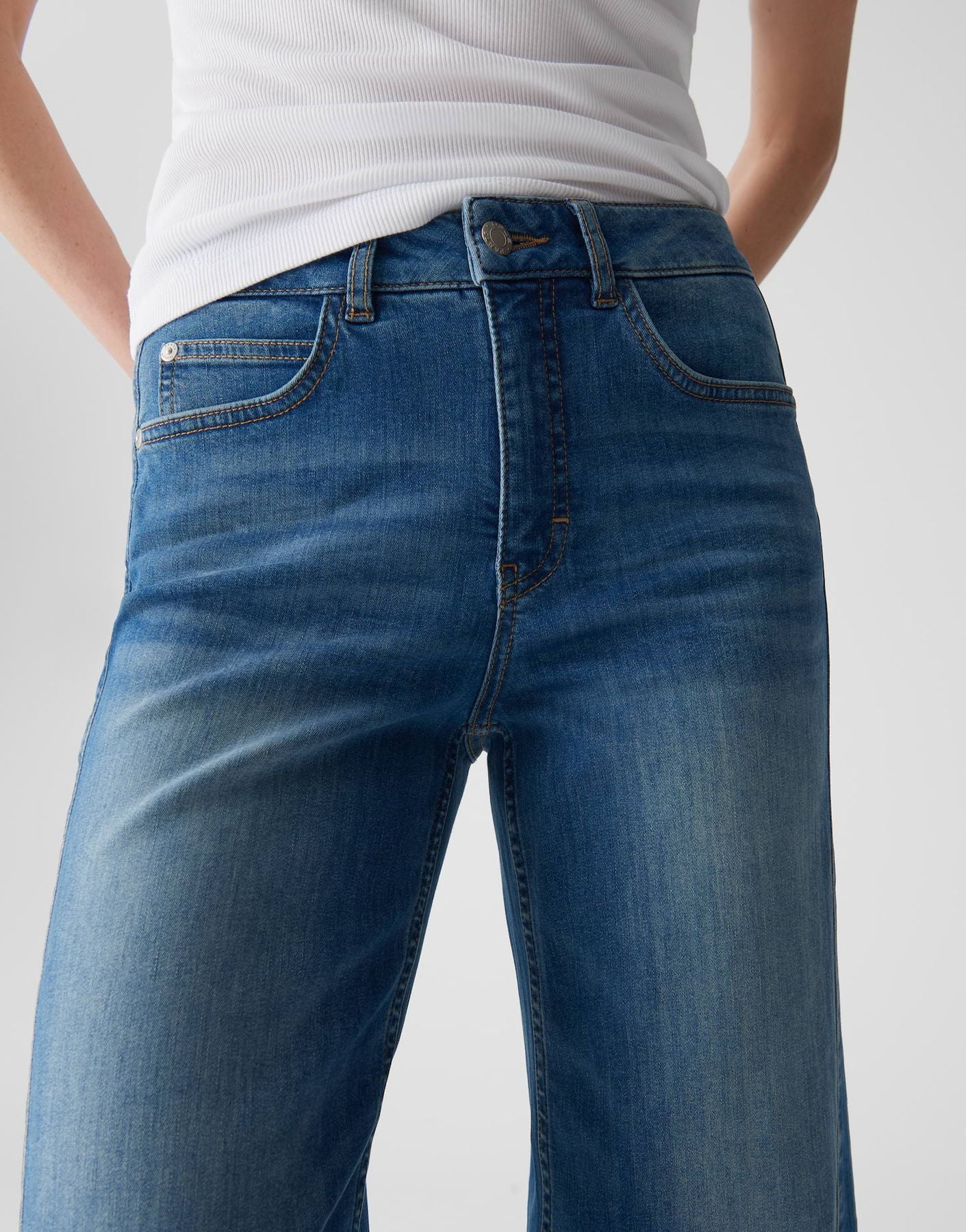weit am Oberschenkel, ovales Bein, Hosenbein Innenlänge in jeder Größe: L26 ca. 68 cm, Model Größe 178 cm – trägt Größe 36, Denim, weicher Griff, authentische Waschung, 5-Pocket-Design, große Gesäßtasche, verdeckter Zip-Fly, leichte Used-Effekte, Crinkle-Effekte