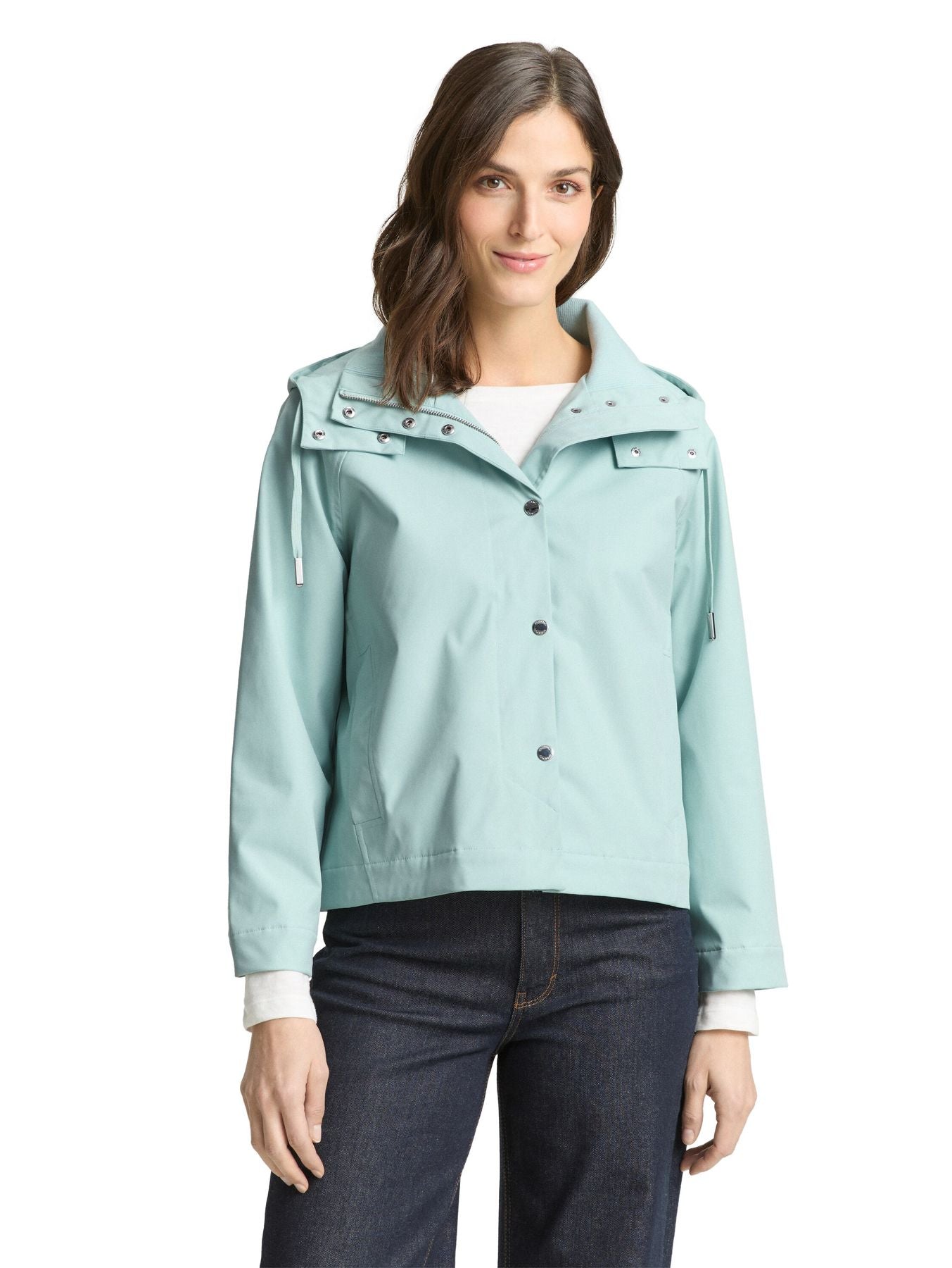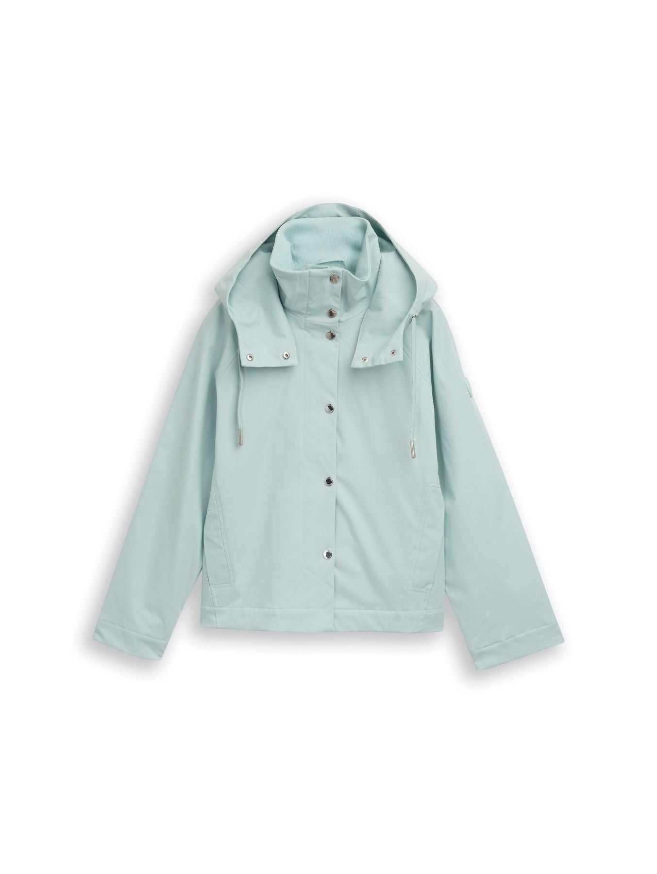 Wasserabweisende Jacke mit Reißverschluss und Druckknopfleiste. Mit seitlichen Eingriffstaschen mit Druckknopf auf der Vorderseite und Logo-Badge am oberen Ärmel.
