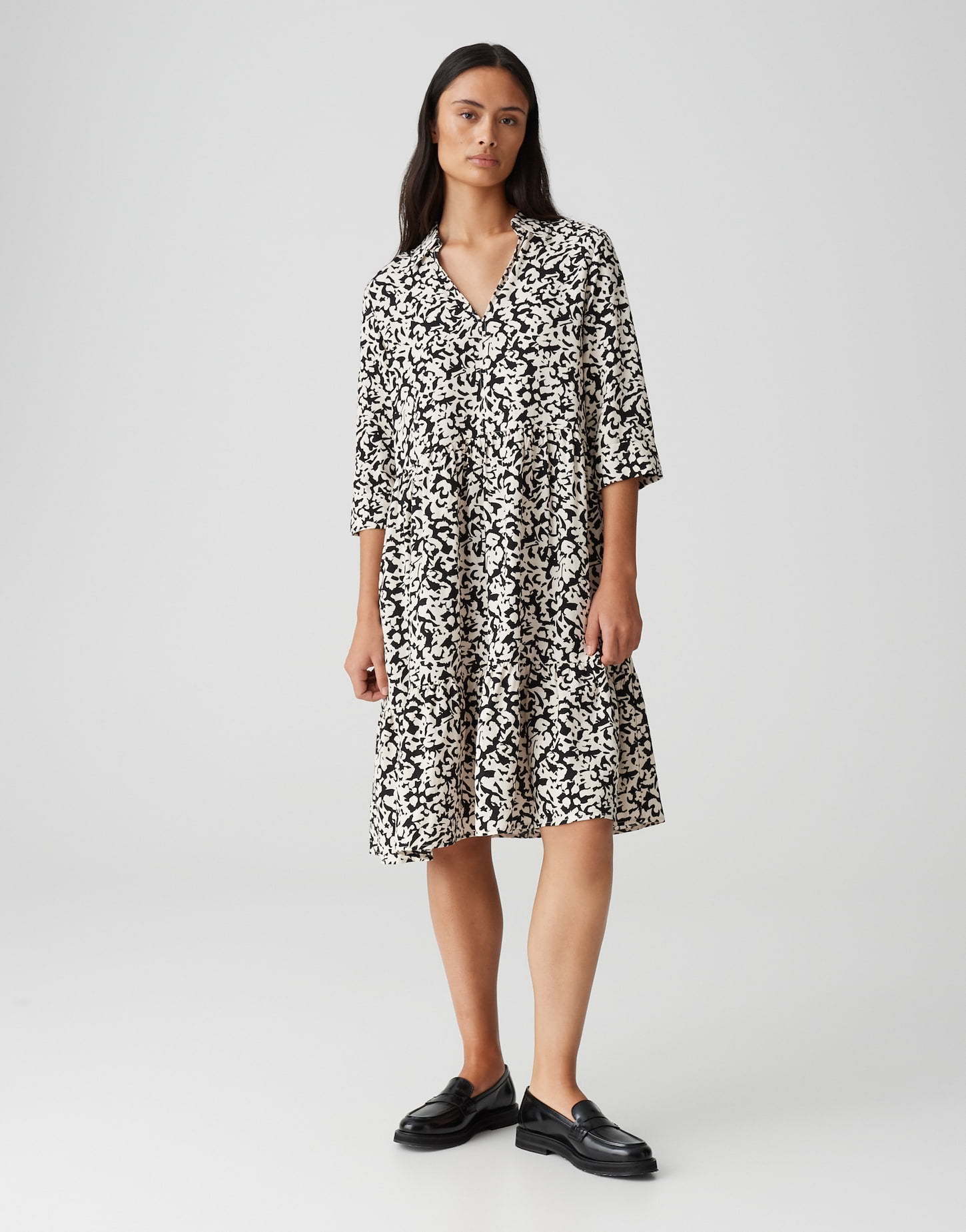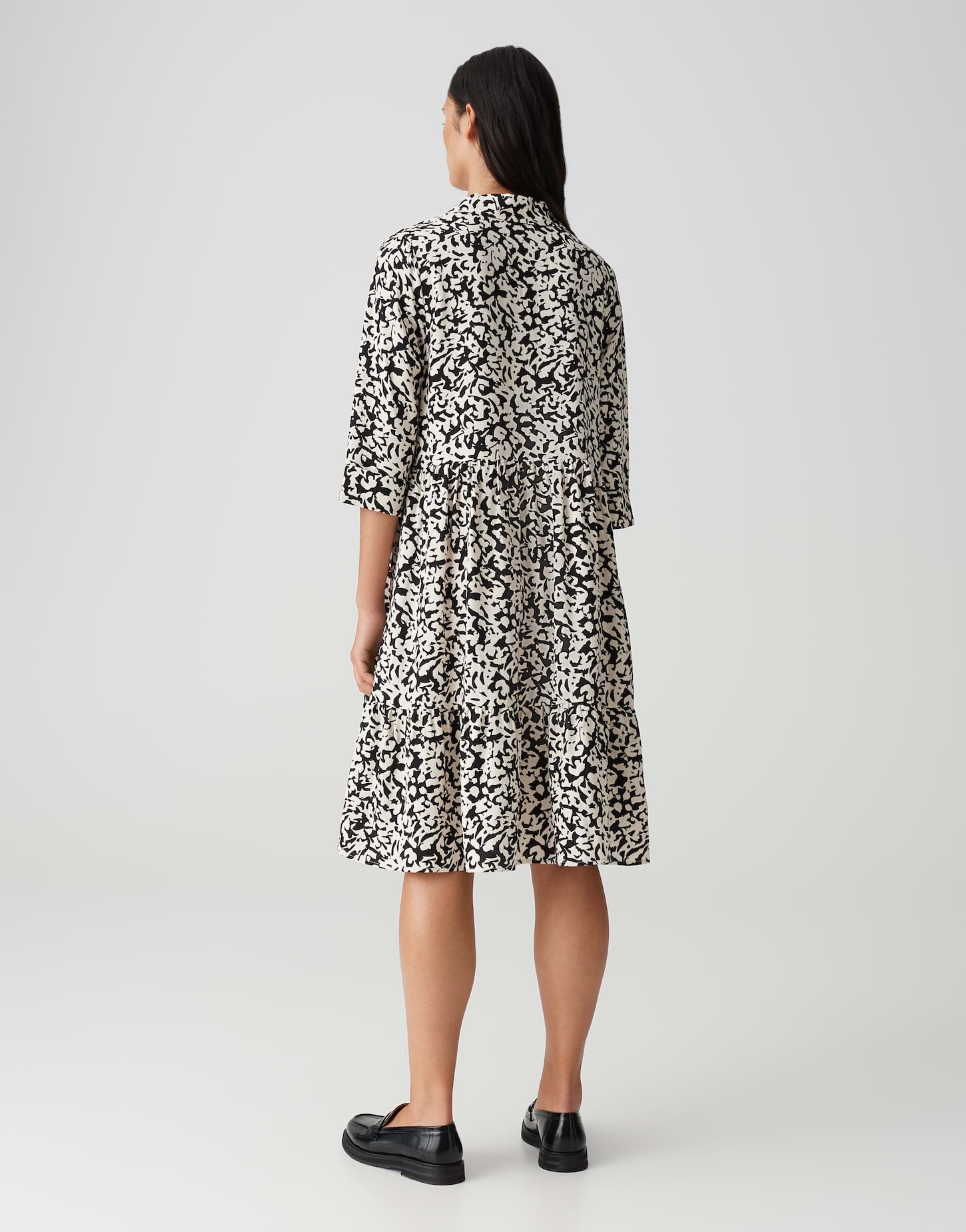 lockere Passform, A-Linie, knielang, 3/4 Arm, V-Ausschnitt, Umlegekragen, Rückenlänge ca. 100 cm bei Größe 36, Model Größe 178 cm – trägt Größe 36, Webware, Jacquard Struktur, weicher Griff, fließender Fall, floraler Print, Volantstufen, Aufschlag am Ärmel