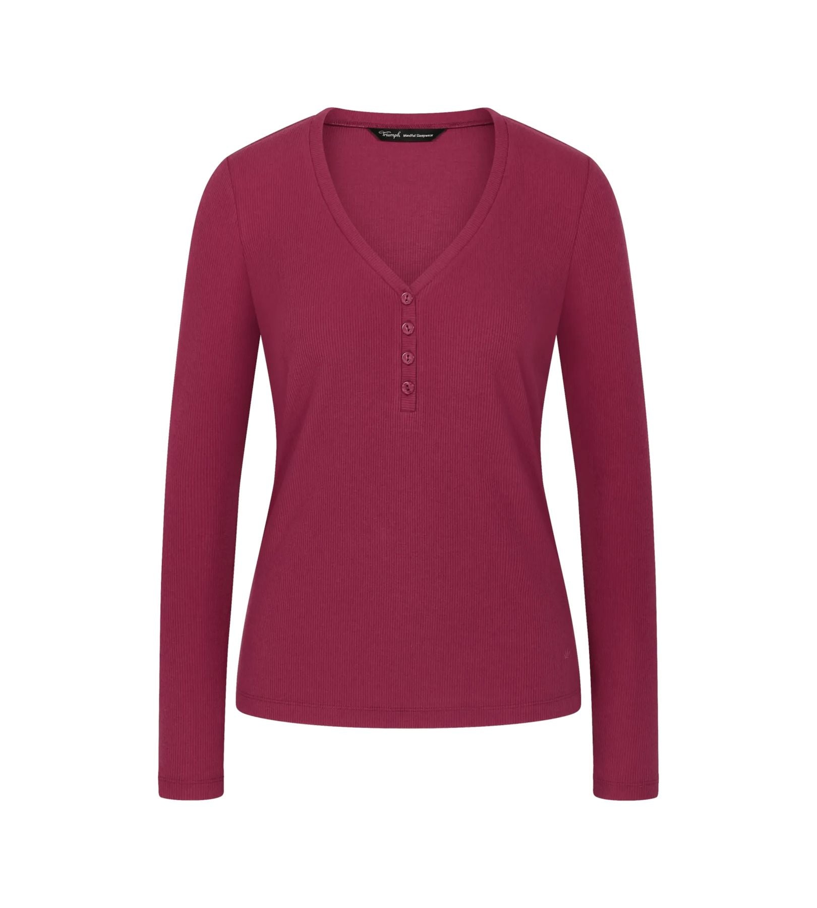 Dieses Langarm-Oberteil mit vielseitigem V-Ausschnitt und variablem Knopfverschluss vereint Komfort und Stil. Der weiche angeraute Rippstoff aus 61 % Recyclingpolyester und 33 % zertifizierter Lenzing-Viskose trägt sich warm und bequem.