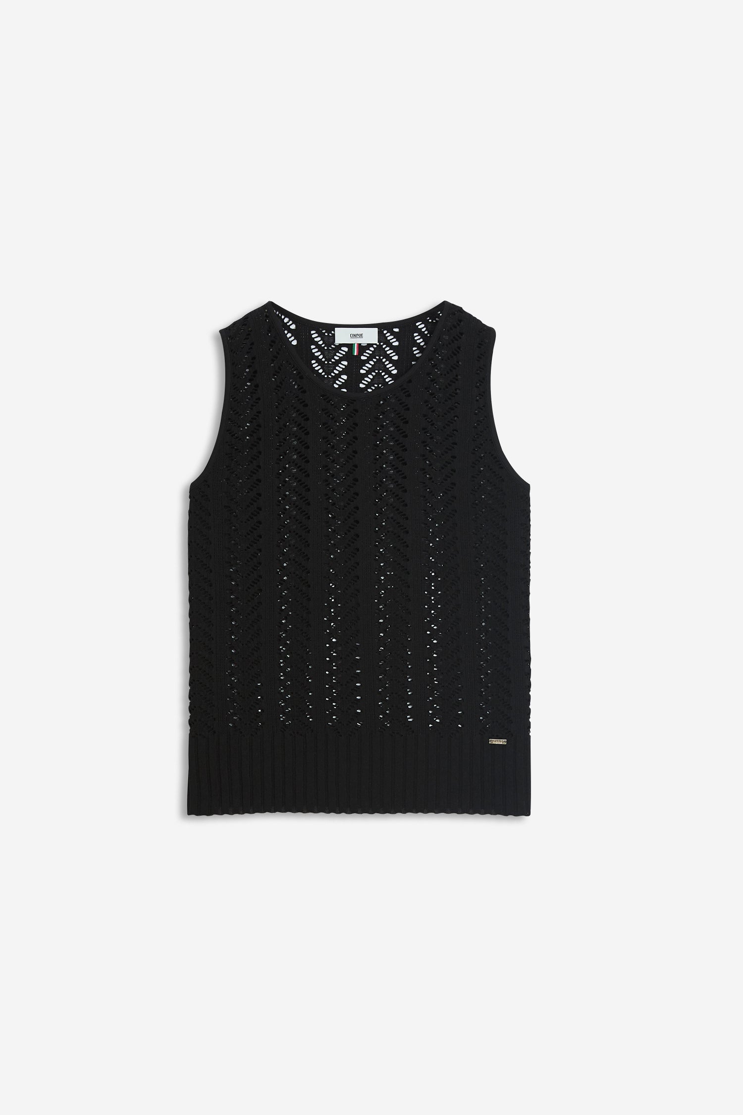 Das angesagte Strick-Top kommt mit breiten Trägern und kann mühelos zum passenden Rock getragen werden.