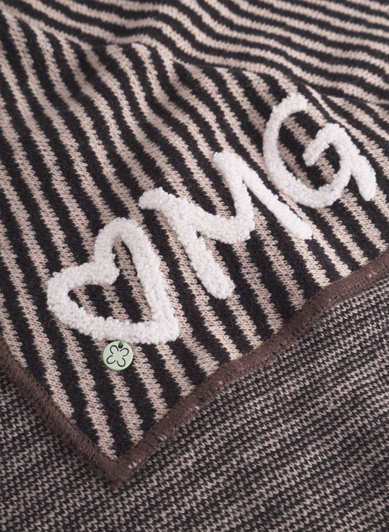 gestricktes Dreieckstuch aus weicher Wollmischung mit Streifengrund und OMG-Patches
