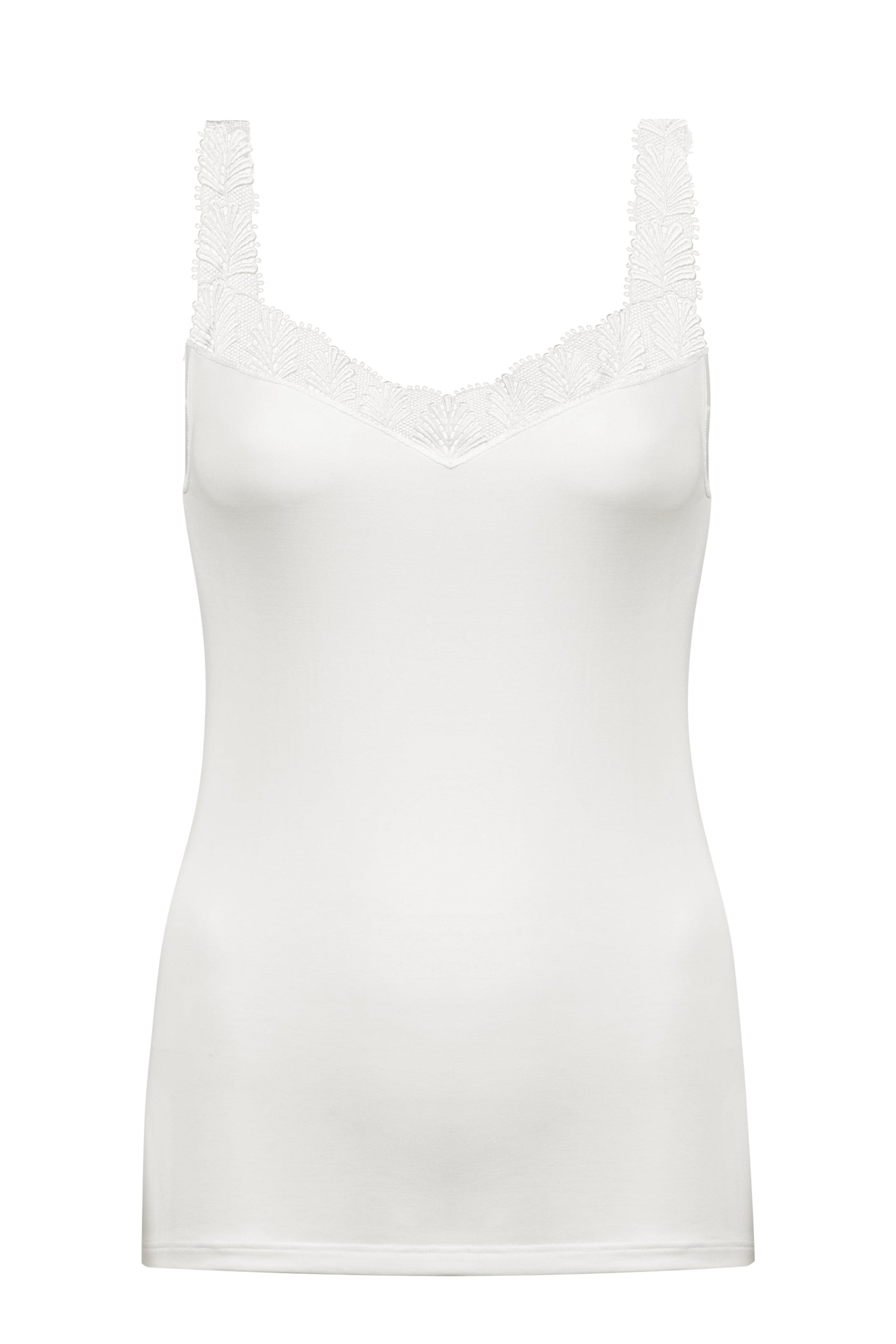 *Schmale Passform*Leichter V-Ausschnitt*Spitzenverzierung am Dekolleté*Gestickte Spitze *Breite Träger, vorne komplett aus Spitze*Runder Rücken*Fließende Qualität