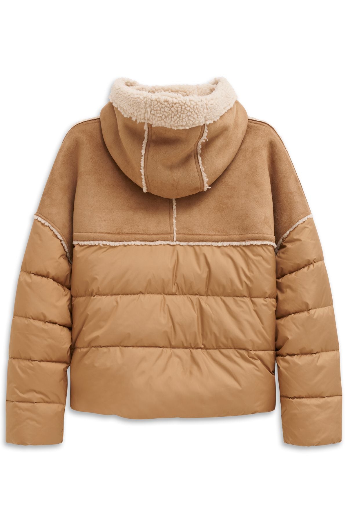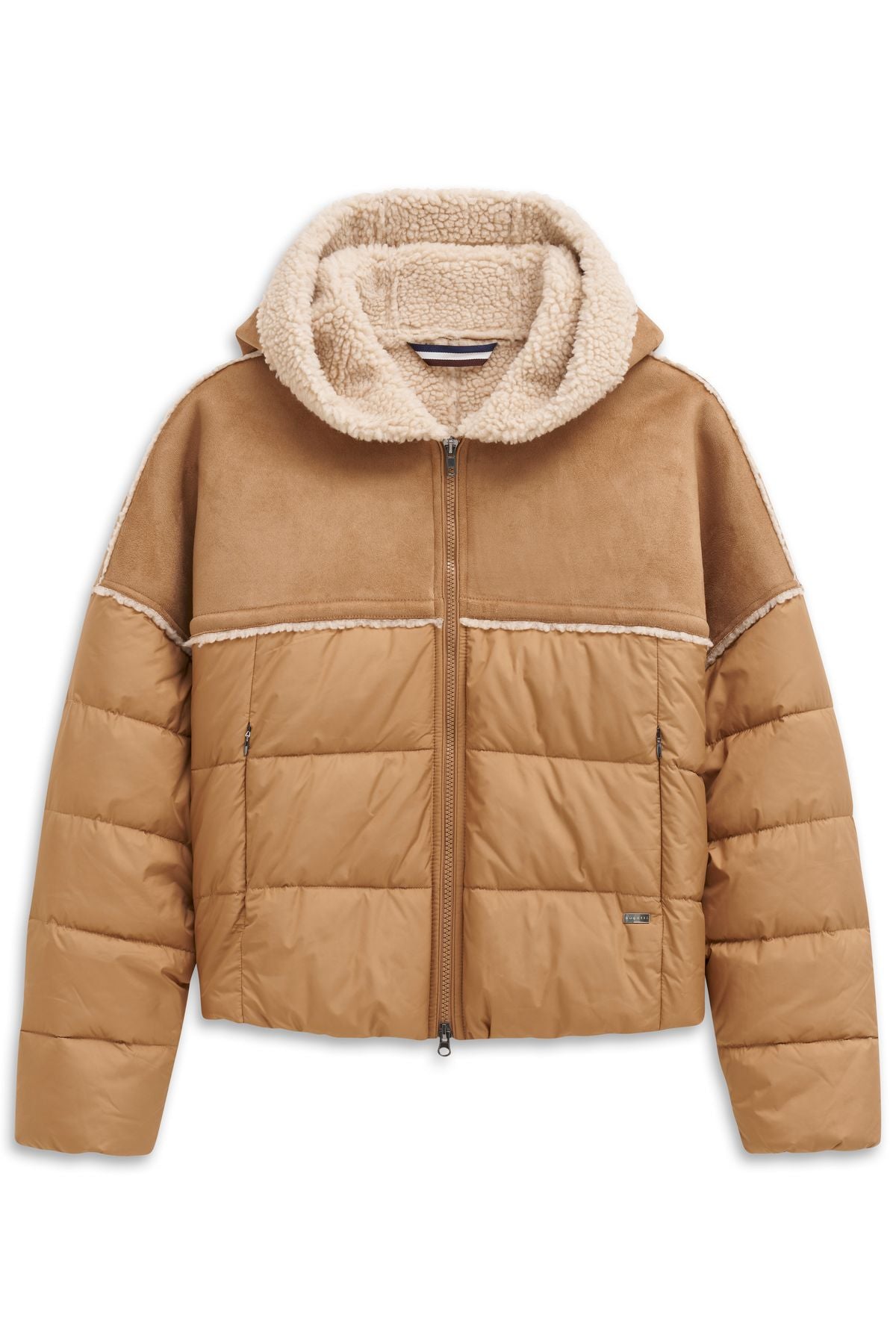Blouson im Materialmix aus versteppten Nylon und soften Lederimitat, mit Kapuze und Reißverschlusstaschen. Neben der kuscheligen Abseite des Fake-Velours sorgt die Sorona Füllung, eine auf nachwachsenden Rohstoffen basierende Füllfaser, für ideale Wärmeisolation. Die bugatti Flag setzt farbliche Akzente im Innenleben. Farbe