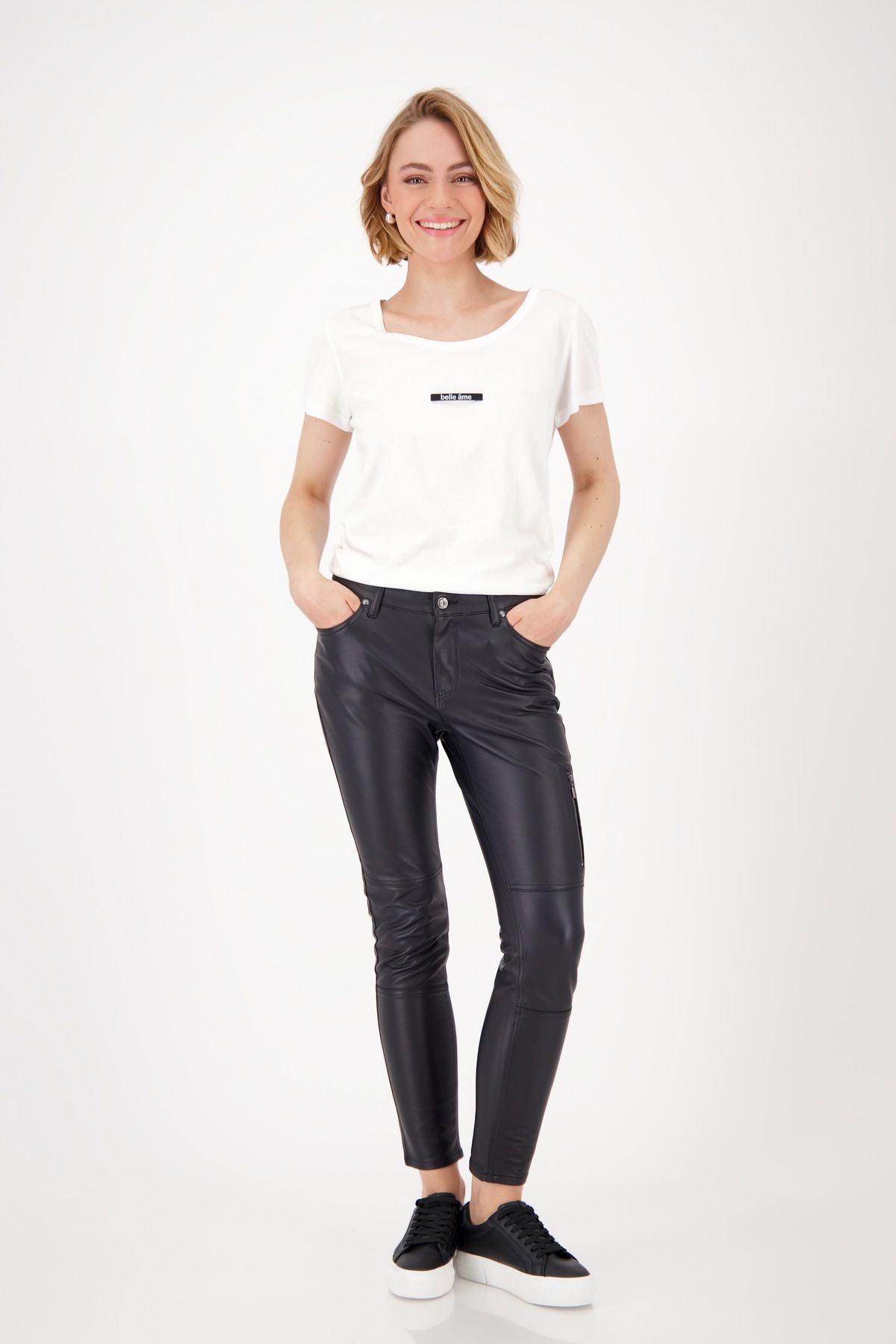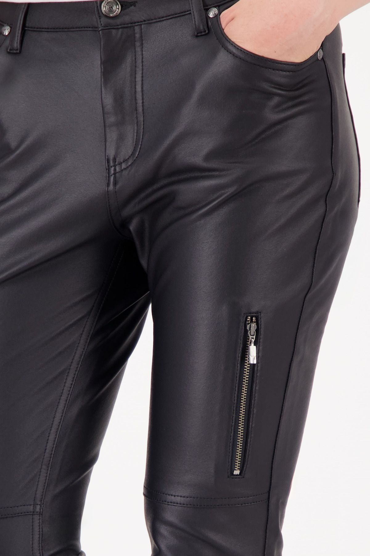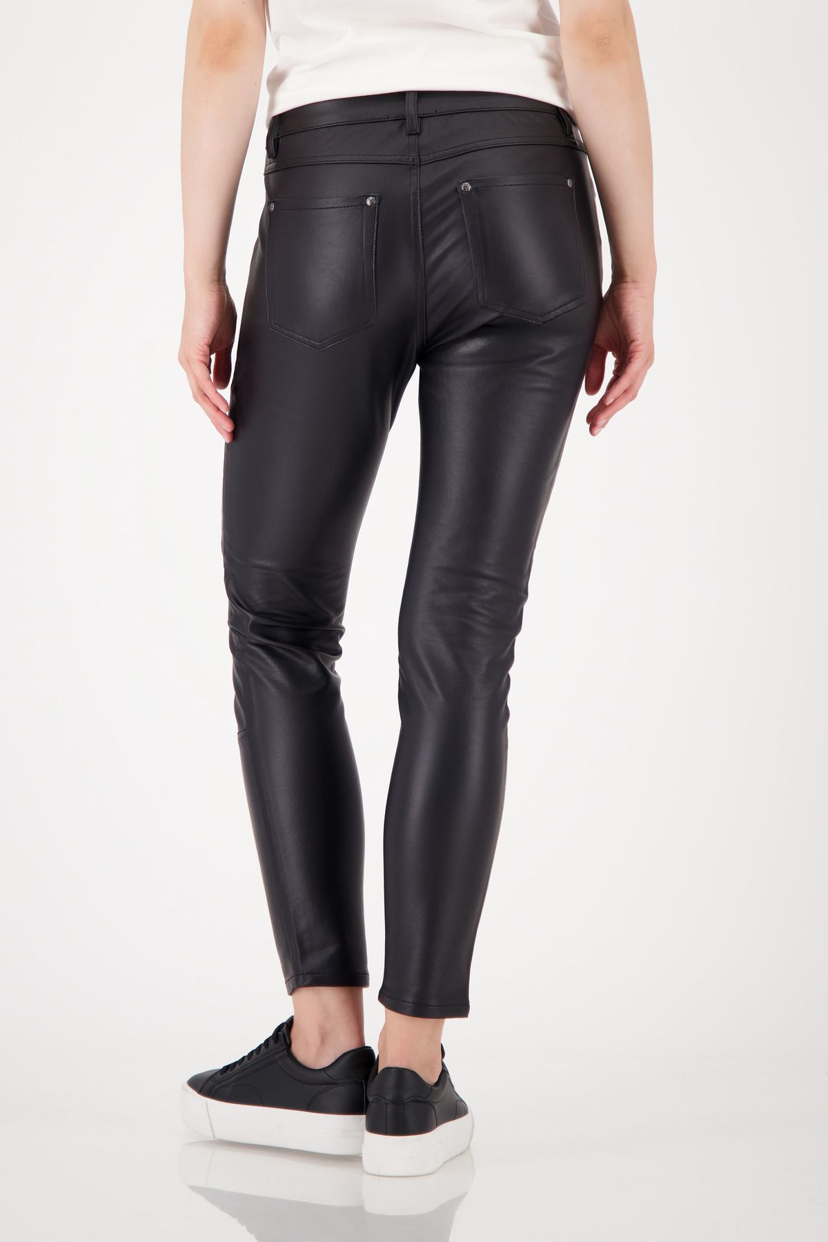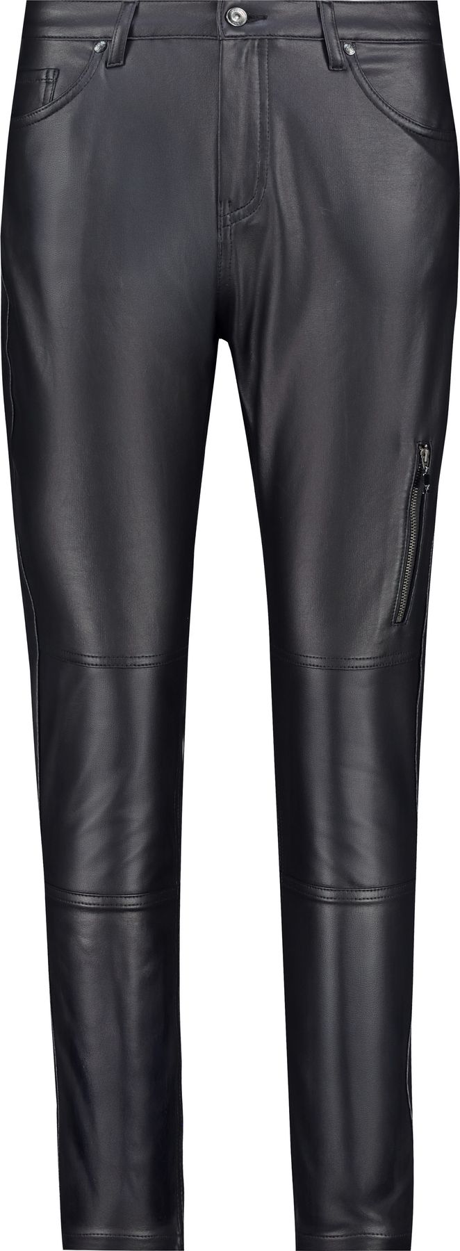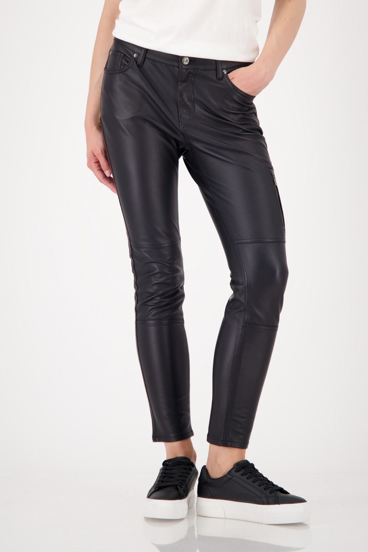 Diese Röhrenhose aus hochwertiger Baumwolle vereint elastischen Komfort mit glänzender Lederoptik. Ein Reißverschluss am Oberschenkel sowie praktische Seitentaschen und aufgesetzte Pattentaschen setzen moderne Akzente. Perfekt für stylische, selbstbewusste Looks. Farbe