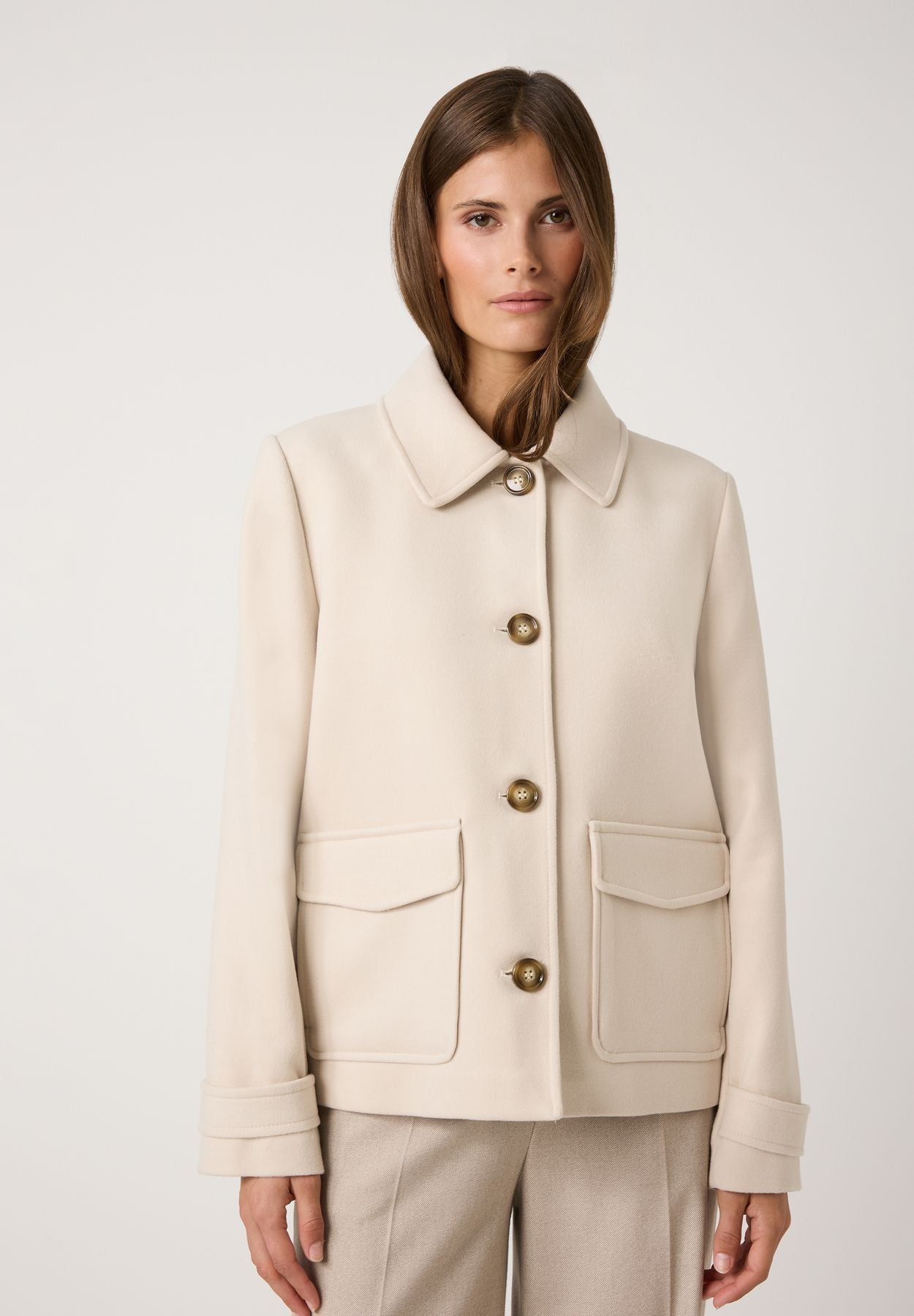 Der cremfarbene, kurze Jacke von MORE & MORE mit aufgesetzten Taschen und Armriegeln sieht sowohl zu Kleidern, als auch zu Röcken und Hosen wahnsinnig stylish aus.