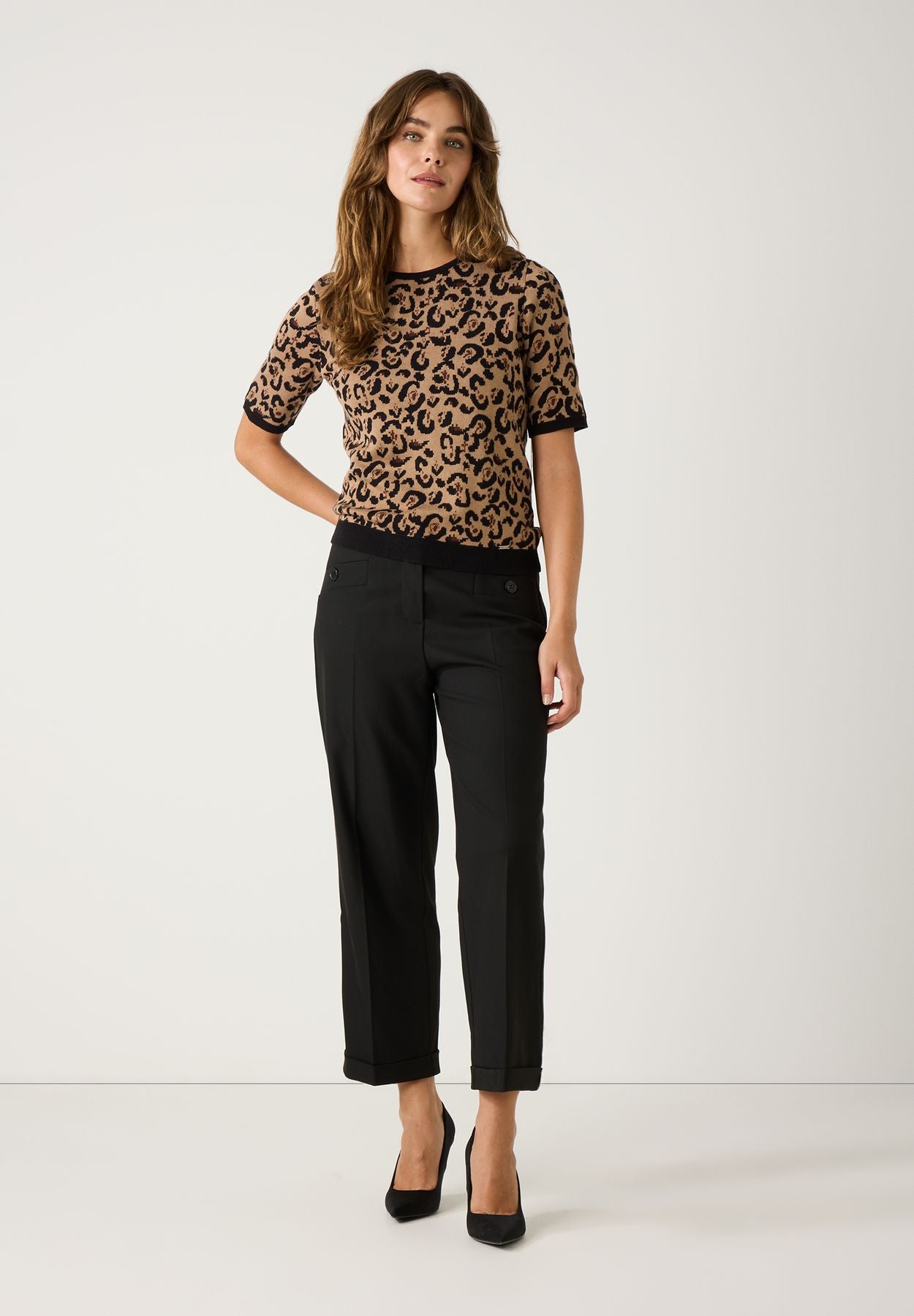Der kurze, figurbetonte Pullover von MORE & MORE mit attraktivem Leomuster und Zierknöpfen am Rückenteil ist vielseitg kombinierbar und wird mit passendem Cardigan zum stylishen Twinset.