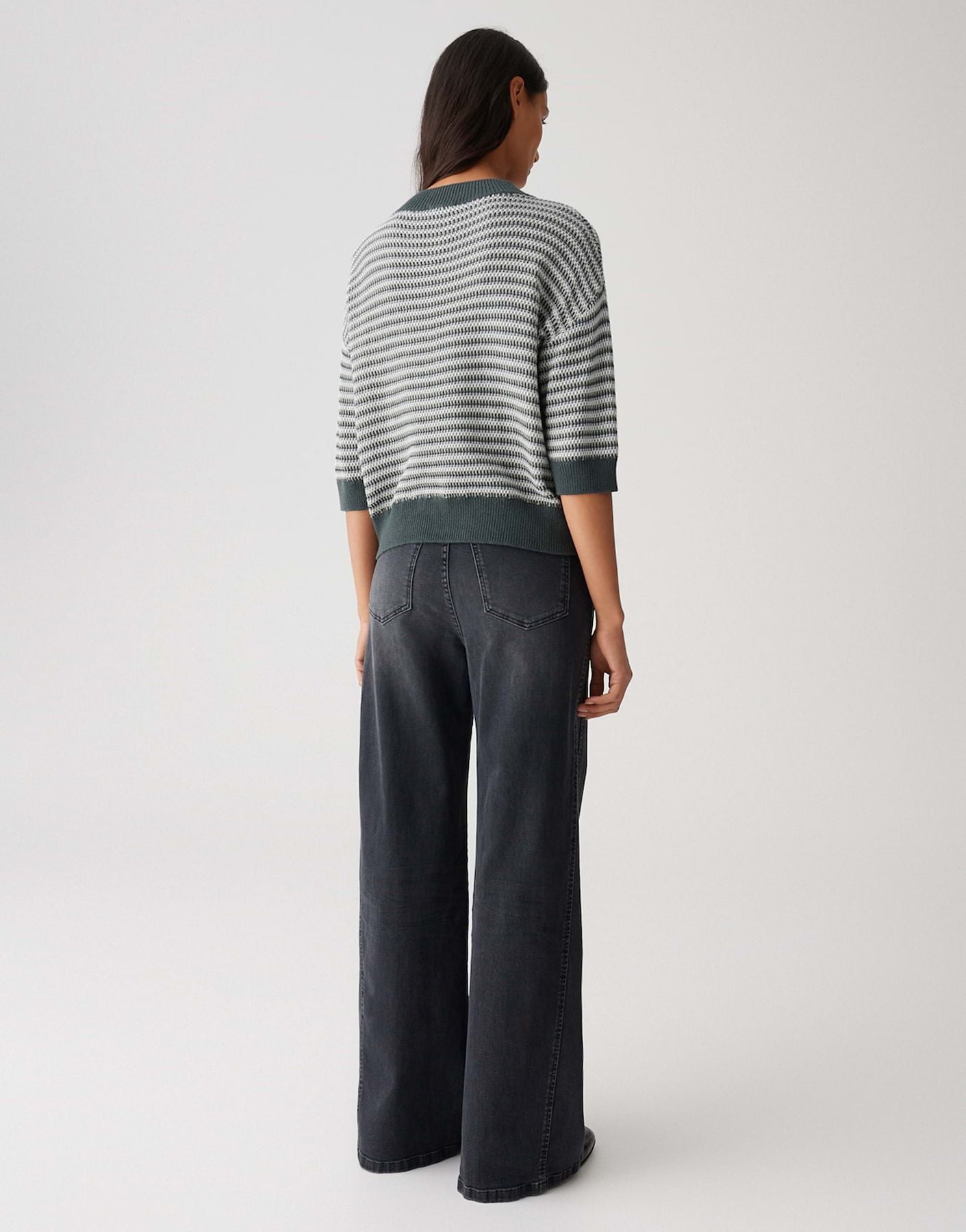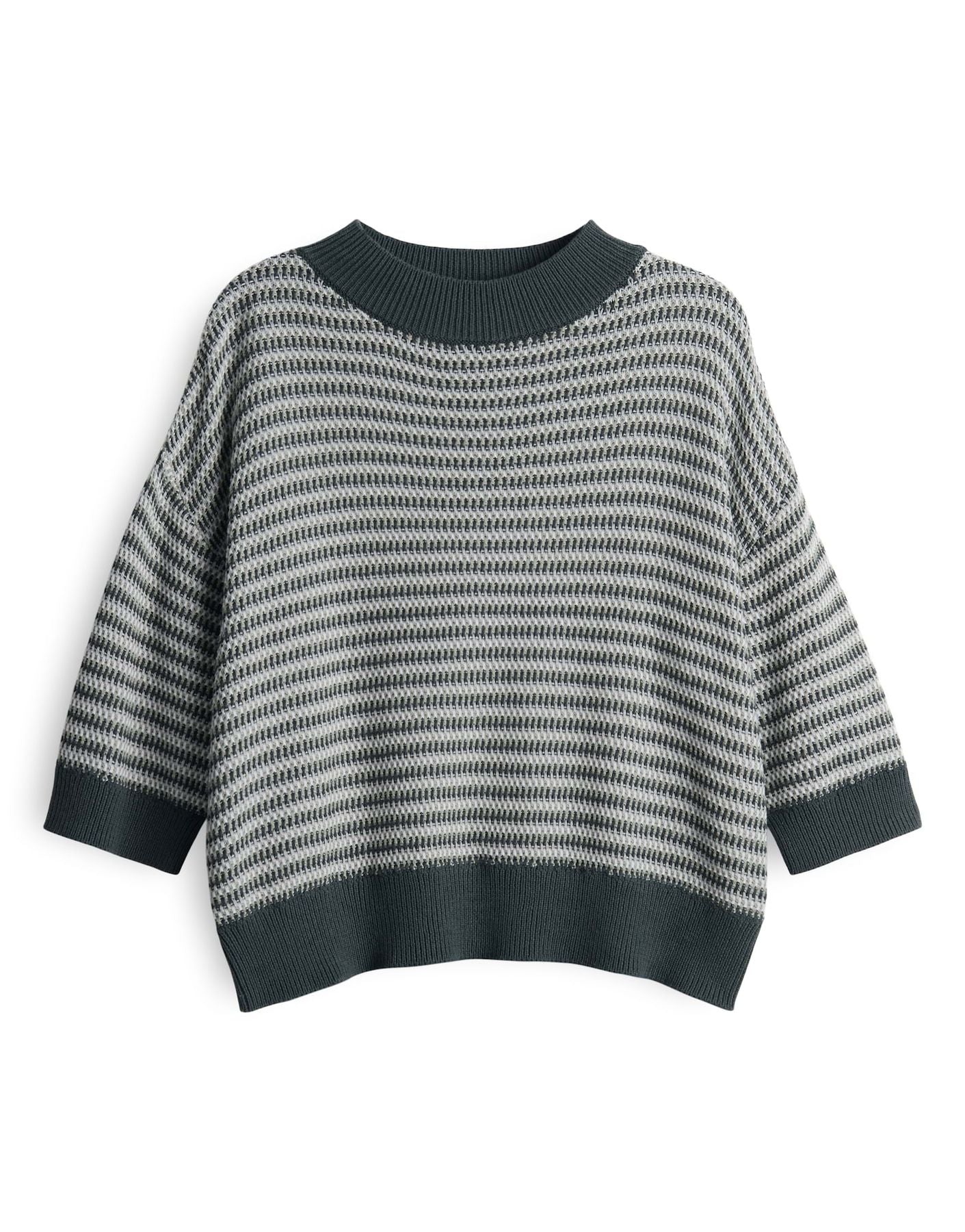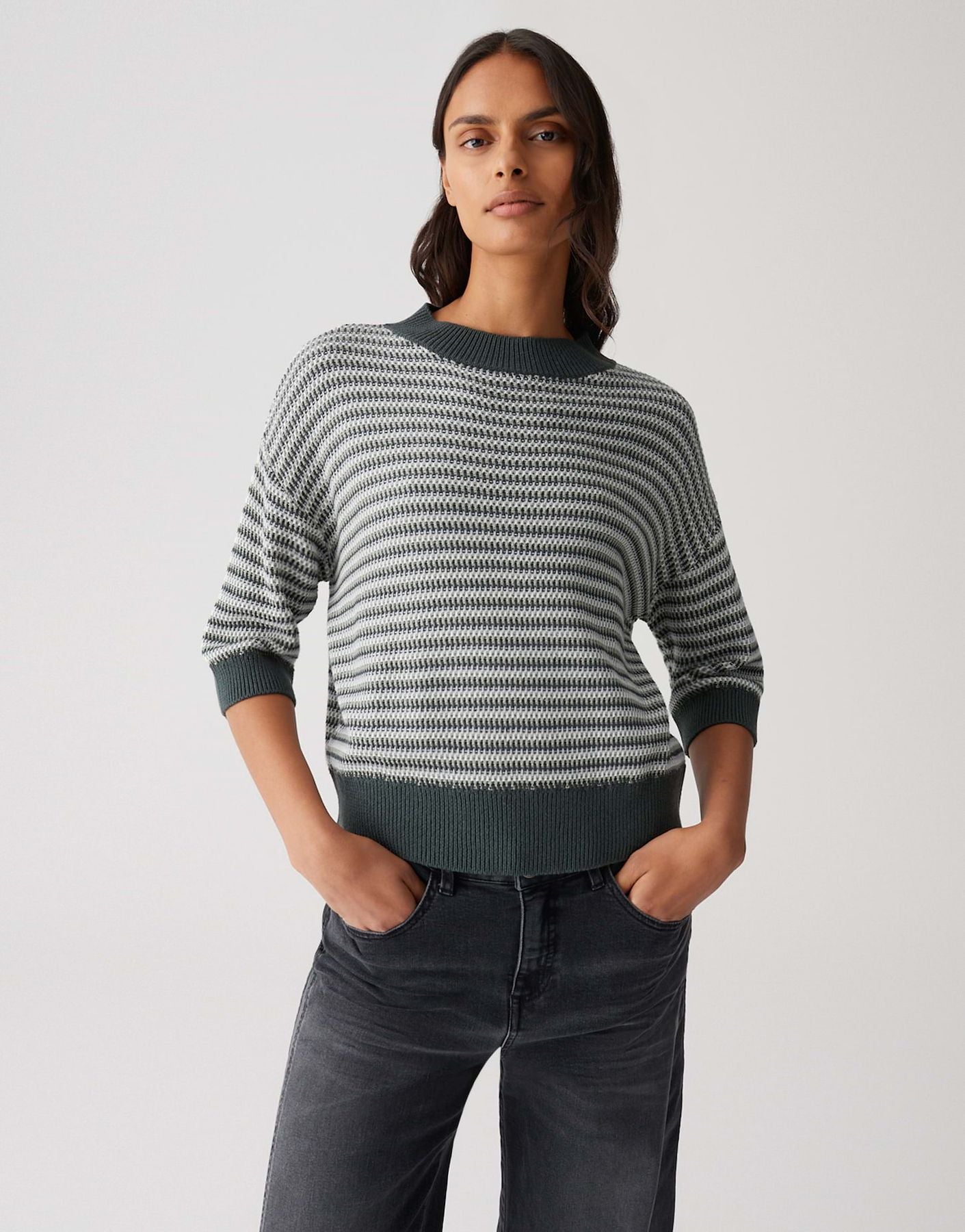 lockere Passform, Boxy Silhouette, leicht verkürzt geschnitten, 3/4 Arm, Rundhalsausschnitt, Rückenlänge ca. 51 cm bei Größe S, Model Größe 178 cm – trägt Größe S, Strick, Jacquard Struktur, weicher Griff, Strickbündchen