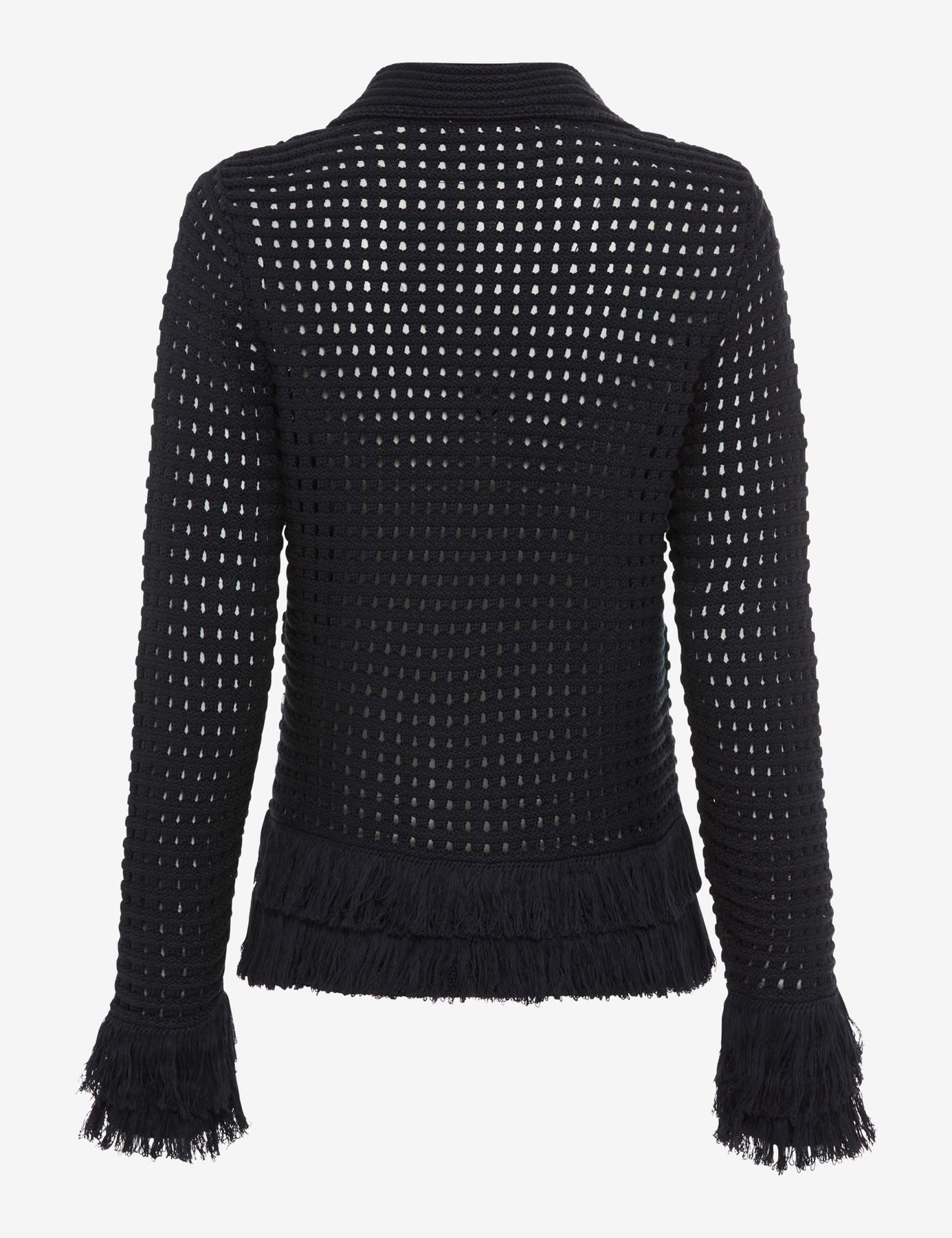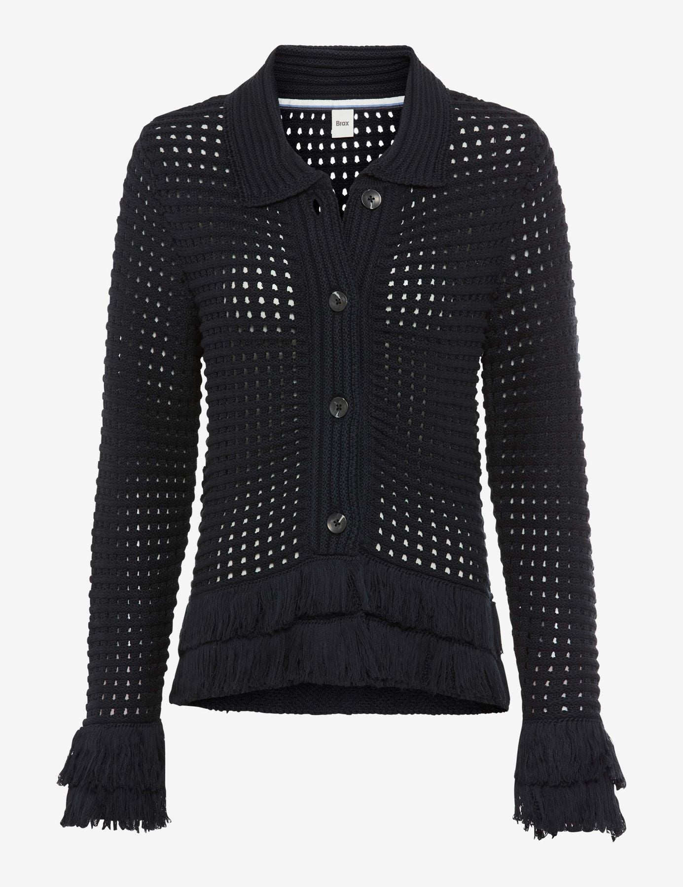 Setzen Sie ein modisches Ausrufezeichen in dieser Saison mit der markanten Strickjacke im STYLE AMI, die feminine Lässigkeit neu definiert. Die gerade Form sorgt für eine entspannte Silhouette, die durch eine klassische Knopfleiste ergänzt wird. Ein echter Hingucker sind die verspielten Fransensäume an den langen Ärmeln, die dem Cardigan eine schwungvolle Dynamik verleihen, stimmig abgerundet durch einen aparten Auslegekragen. Dieses ausdrucksstarke Design trifft auf puren Tragekomfort, denn die Damen-Strickjacke ist vollständig aus hochwertiger Baumwolle gefertigt. Die beliebte Naturfaser schmeichelt der Haut mit ihrer weichen Haptik und ist zudem angenehm atmungsaktiv, was sie ideal für wärmere Tage macht. Besonders raffiniert wirkt die feine Ajour-Stricktechnik, die durch ihre charakteristischen, kunstvollen Durchbruchmuster eine luftige Leichtigkeit und eine subtile Transparenz erzeugt, perfekt für stilvolle Lagenlooks.