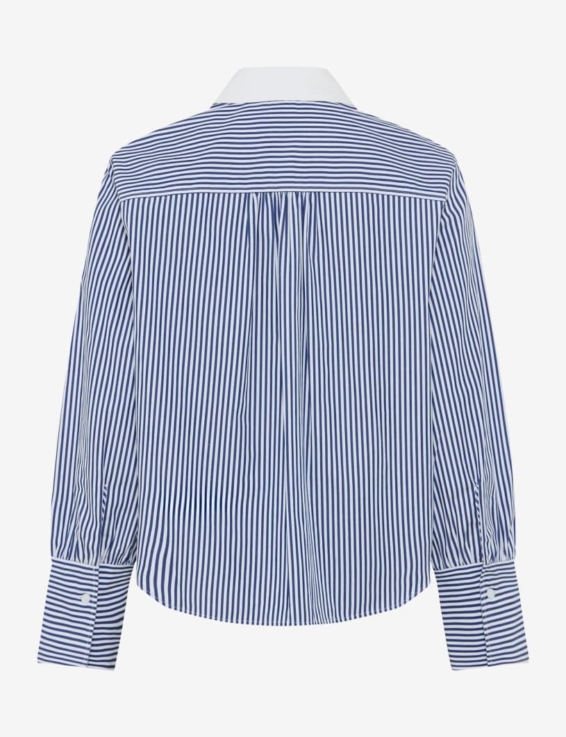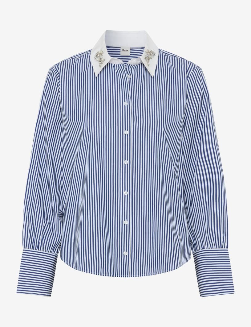 Mit Extravaganz und einer erfrischenden Interpretation klassischer Styles entfaltet die Hemdbluse im Style VICA GLAM ihr Fashion-Potenzial. Die oversized Silhouette mit langem Arm und markantem Hemdkragen setzt auf lässige Eleganz, wobei feminine Raffungen und die dekorative Schulterpasse souveräne Akzente bei der Damenbluse setzen. Vor allem die funkelnde Strasselemente am Kragen bilden raffinierte Highlights in der Optik. Breite Manschetten und eine klassische Knopfleiste runden das Design ab und unterstreichen die außergewöhnliche Linienführung der Bluse. So wird das Streifenthema modisch und trendsicher in Szene gesetzt. Reine Baumwolle verspricht nicht nur ein angenehm luftiges Tragegefühl, sondern steht auch für natürliche Atmungsaktivität und Pflegeleichtigkeit. Dabei sorgt die feine Popeline-Qualität für eine glatte Oberfläche, die mit weichem Griff begeistert. Das macht diese Hemdbluse zum Must-have mit besonderem Flair. Farbe