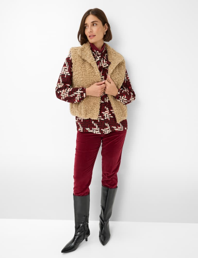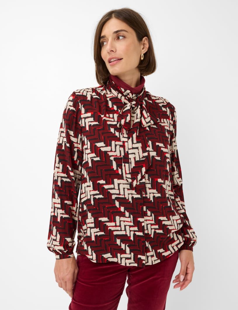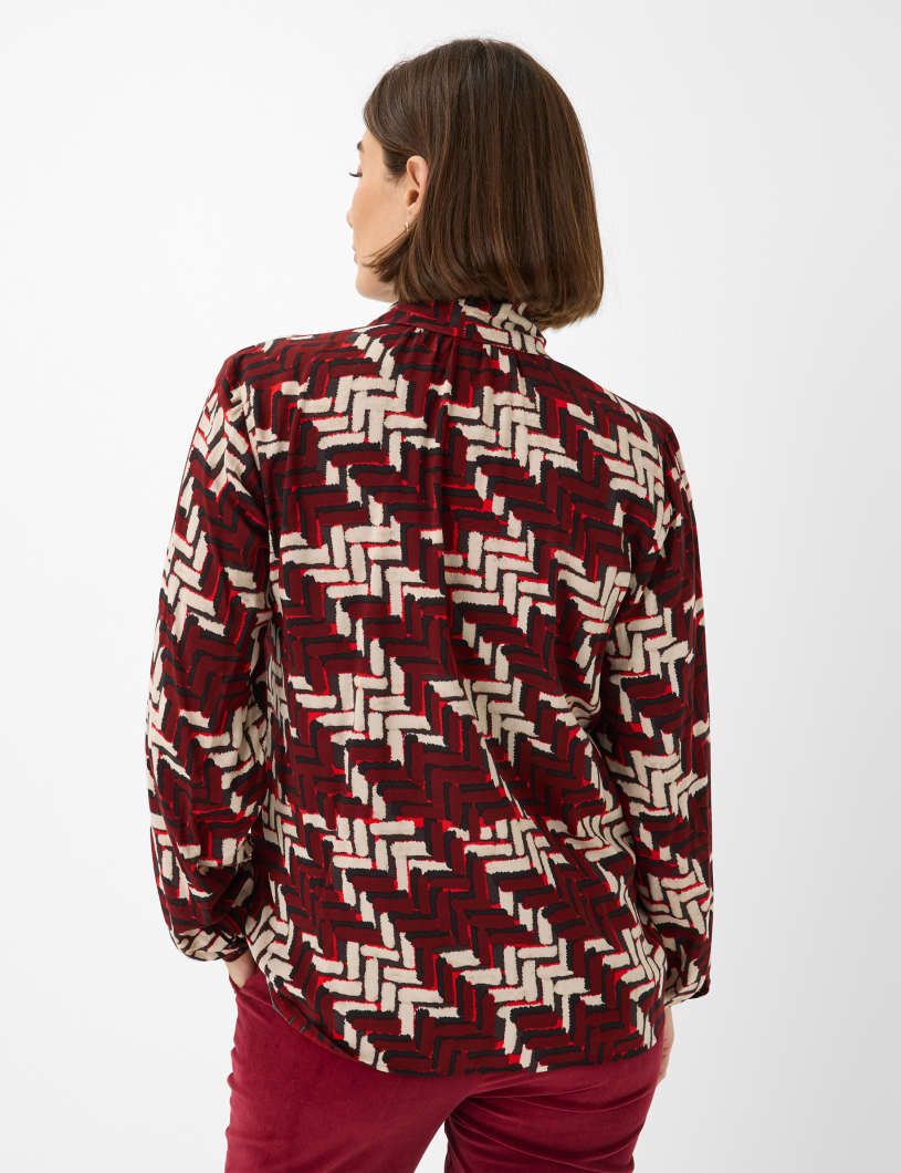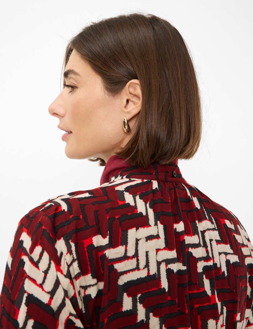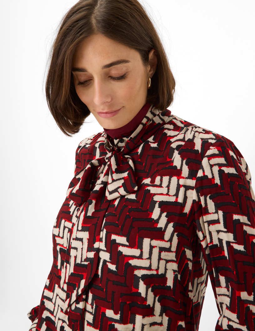 Die Bluse im STYLE VIVI bringt mit ihrem ausdrucksstarken, grafischen Allover-Print frischen Schwung in Ihre Garderobe. Das moderne Muster spielt mit Richtungswechseln und Kontrasten, die dem Look eine dynamische Tiefe verleihen. Besonders raffiniert: Die integrierte Schluppe am Kragen lässt sich variabel binden – ob als Schleife, Knoten oder locker fallend und verleiht der Bluse eine feminine, elegante Note. Eine verdeckte Knopfleiste und schmale Manschetten mit 1-Knopf-Detail unterstreichen den cleanen, hochwertigen Look. Gefertigt aus 100 % Viskose überzeugt die Schluppenbluse durch einen glatten Griff und einen angenehmen, luftigen Fall. Popeline ist ein dicht gewebter Stoff mit matter Oberfläche, der für seine Leichtigkeit, Strapazierfähigkeit und edle Struktur bekannt ist. In Kombination mit Viskose entsteht ein Gewebe, das atmungsaktiv, pflegeleicht und besonders angenehm auf der Haut ist. Farbe