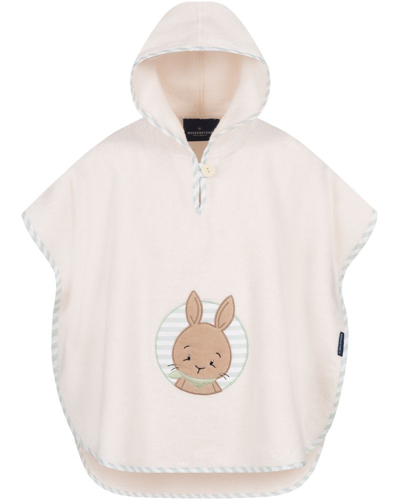 Badeponcho mit Kapuze und Knopf mit zauberhafter Hasen-Applikation auf der Vorderseite. Besonders kuschelige, voluminöse Luxus-Frottierware mit gestreifter Paspel. Material: 100 % Luxus Baumwolle. Auf Schadstoffe geprüft: STANDARD 100 by OEKO-TEX®.