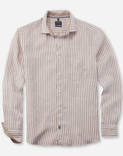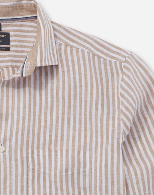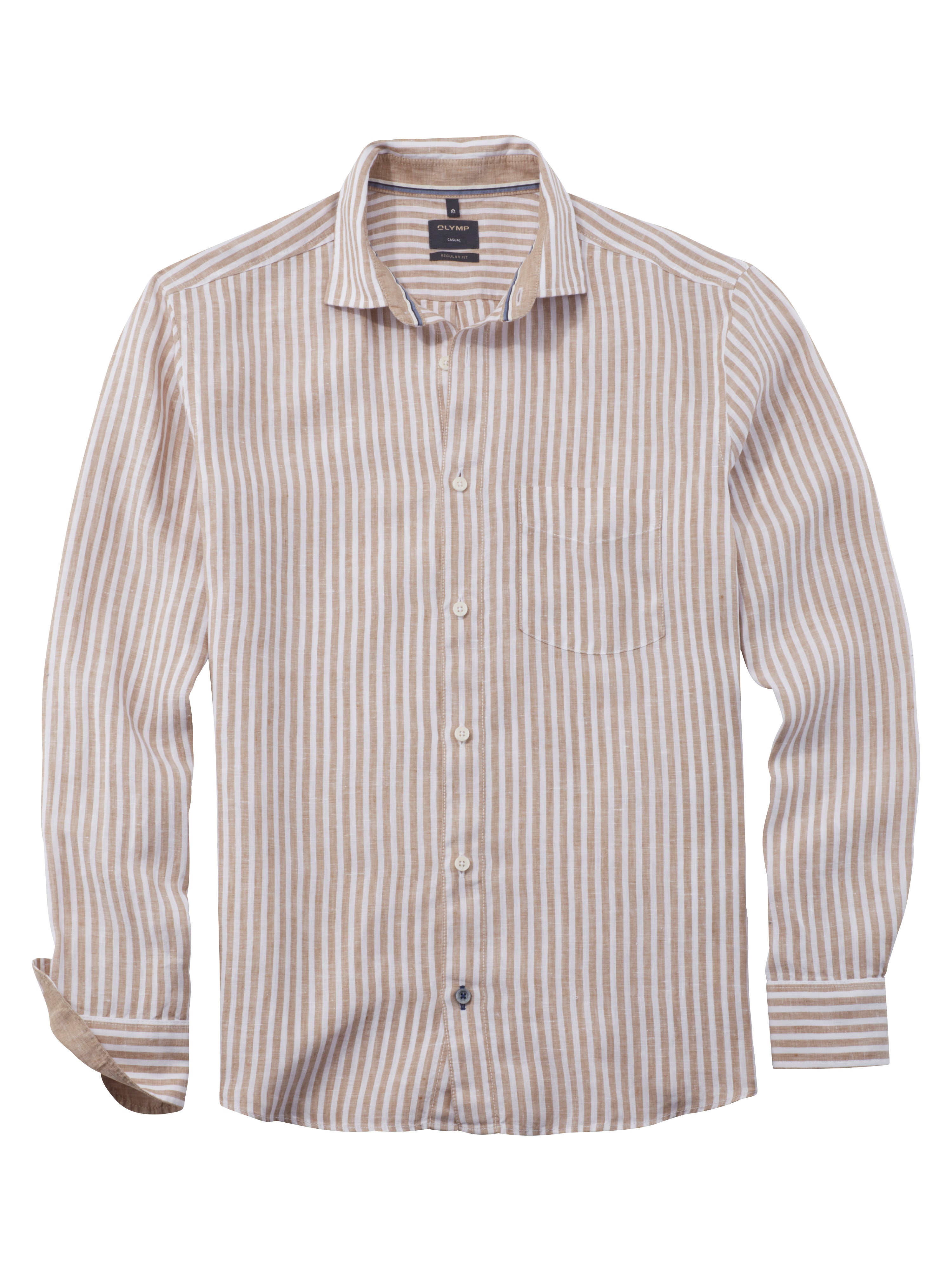 Als stilvolles Basic überzeugt das OLYMP Casual mit Römerstreifen in Beige. Die reine Leinenqualität zeigt die charakteristische Textur und bietet gerade an wärmeren Tagen beste Trageeigenschaften. Ein vielseitiger Look für Freizeit und Casual-Fridays. Mit Kent, Knopfleiste und gerundetem Saum. Je nach Farbvariante mit Kontrastbeschlag.