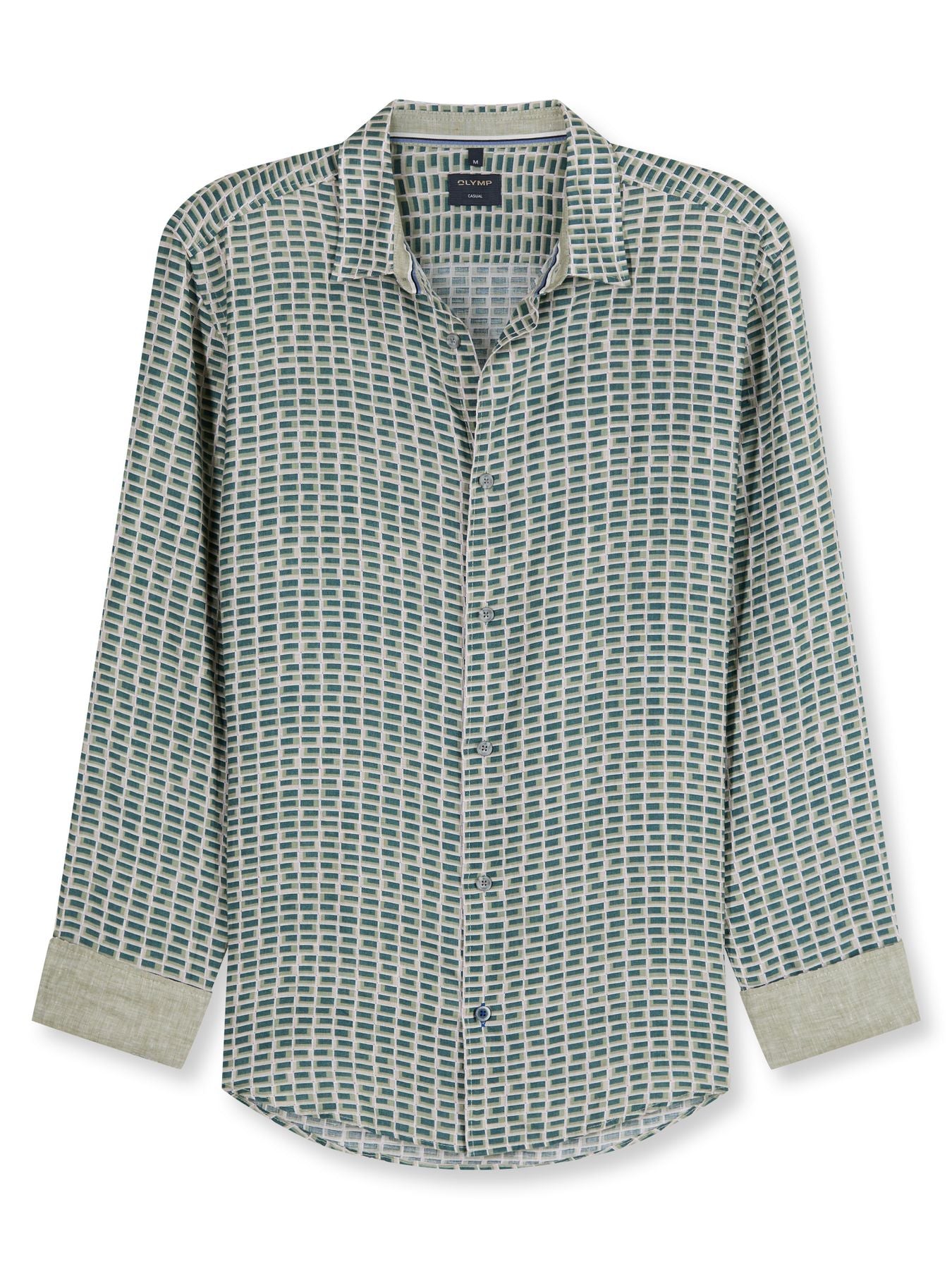 100% Leinen. Ein OLYMP Casual-Hemd in Oliv mit Print im gridartigen Karo in Grün und Beige. Kent-Kragen mit Kontrastgewebe. Auch die Manschetten sind mit Kontrastgewebe akzentuiert und verstellbar. Eine klare Optik, die Struktur ins Outfit bringt. Farbe