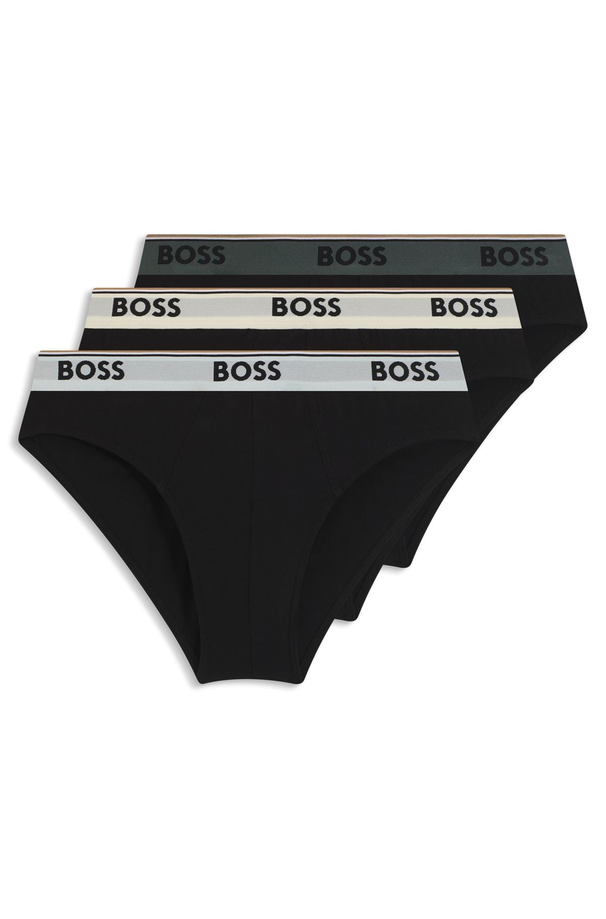 Drei Paar eng anliegende BOSS Menswear Slips mit Signature-Streifen und sich wiederholenden Logos am Bund. Die mittelhohen Styles sind aus einem komfortablen Stretch-Baumwolle mit Elasthan-Anteil gefertigt. Farbe