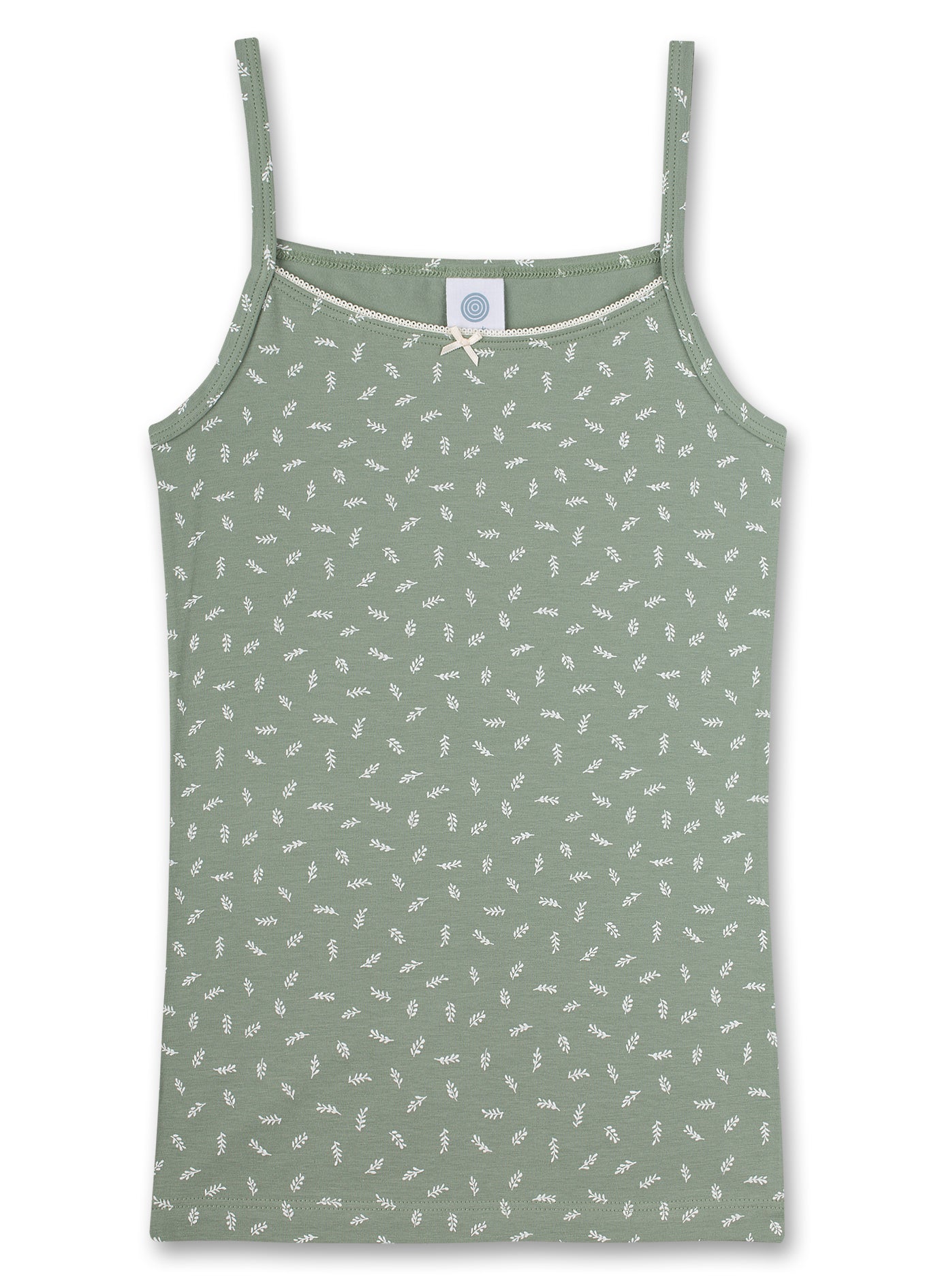 Verspieltes Mädchen-Unterhemd mit schmalen Trägern und mit feinem Blätterzweig-Alloverprint von Sanetta. Farbe