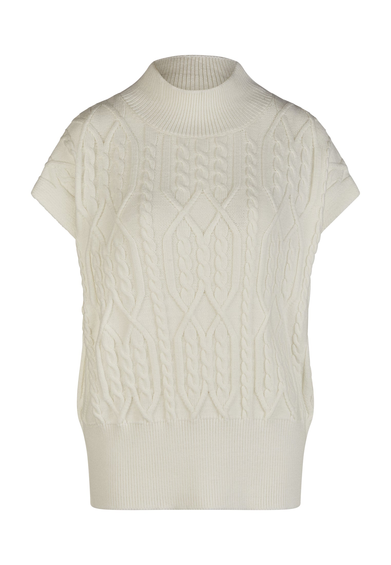 Unser Vest-Over im klassischen Zopf-Muster verbindet traditionelle Strickkunst mit modernem Design. Die Baumwollmischung sorgt für einen weichen Griff, während der Turtleneck und die boxy Passform eine zeitgemäße Silhouette zeichnen. Dieses ärmellose Stück mit überschnittenen Schultern und Rippenabschlüssen an Saum, Armloch und Ausschnitt ist ein vielseitiges Essential, das sowohl Eleganz als auch Komfort bietet.