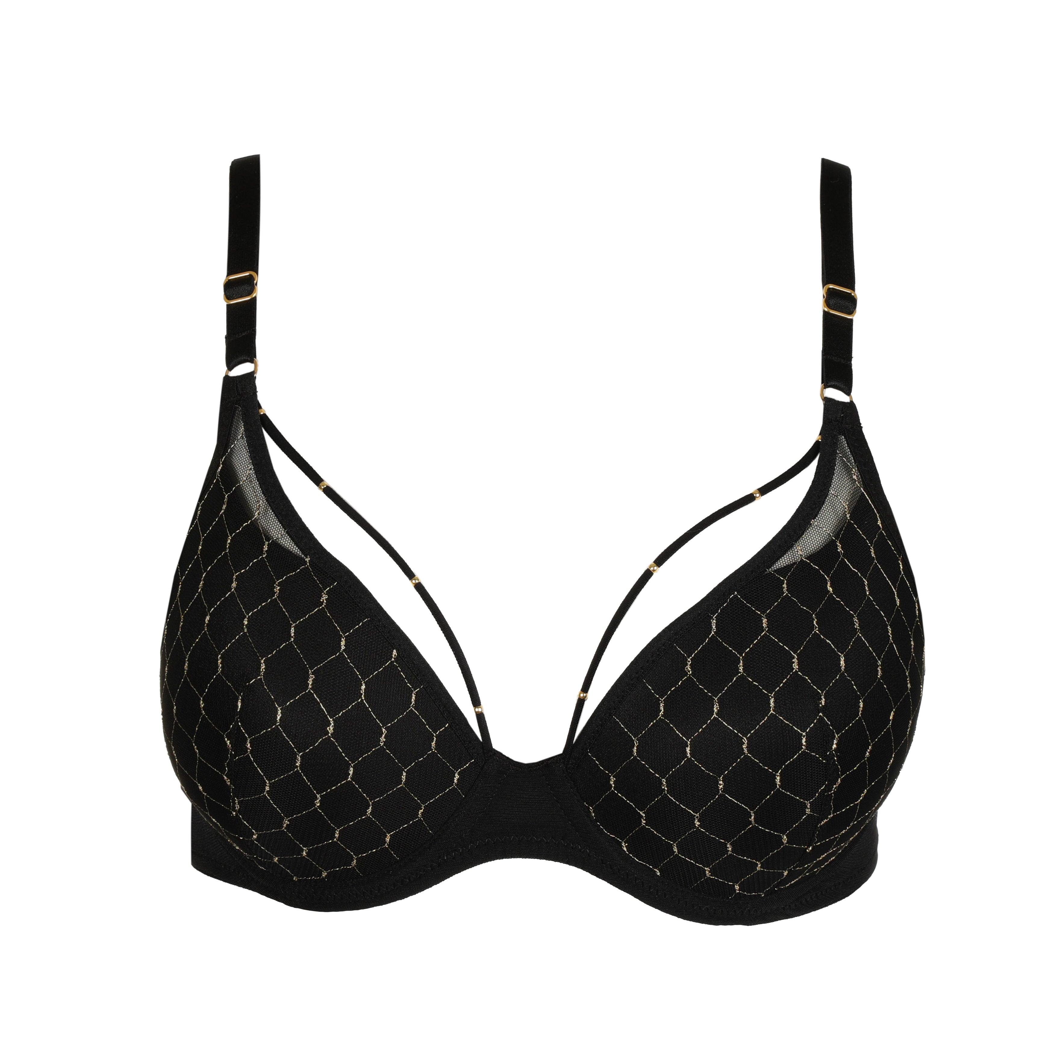 Das Dekolleté dieses unterlegten BHs ähnelt der Form eines Herzens. Die Körbchen sind in der Mitte tief ausgeschnitten und gehen seitlich höher, sodass sie die Wölbung der Brüste umschließen.