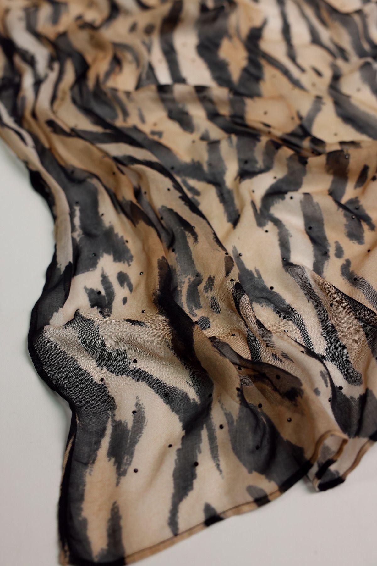 Dieses modische Tuch aus fließender Viskose überzeugt mit einem ausdrucksstarken Allover-Tigermuster mit Strasssteinen. Die rechteckige Form ermöglicht vielseitige Styling-Varianten – ob lässig um den Hals, als Haarband oder dekoratives Accessoire. Der weiche Stoff trägt sich angenehm leicht und verleiht jedem Outfit das gewisse Etwas. Farbe