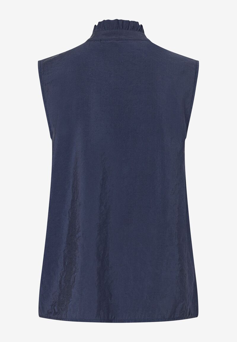 Die ärmellose dunkelblaue Bluse von MORE & MORE mit modernem Rüschen-Detail wird mit passender Hose zum stylishen Zweiteiler der sowohl auf der Sommer-Party als auch im Office funktioniert. Farbe