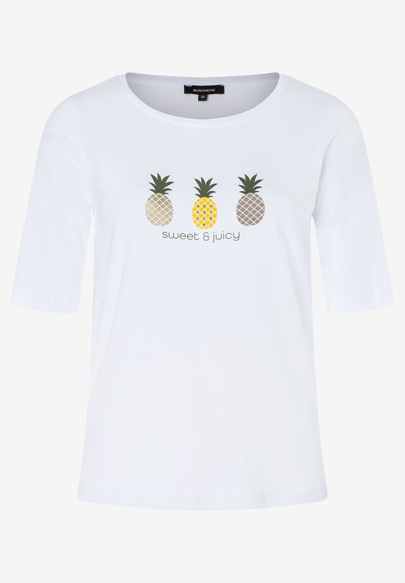 Das weiße Halbarm-Shirt von MORE & MORE mit attraktivem Ananas-Print auf der Front versprüht pure Sommerlaune und ist ein absolutes Allround-Talent. Es funktioniert zur kurzen Bermuda genauso gut wie zum fließenden Meshrock und kann wahlweise auch zum klassischen Businessanzug getragen werden.