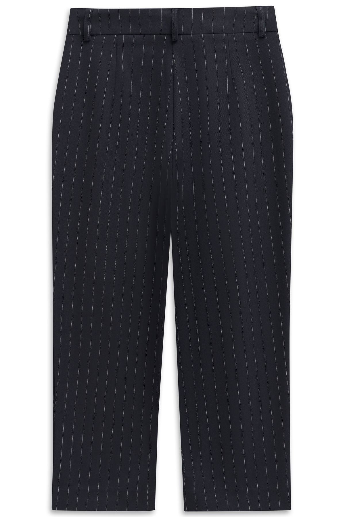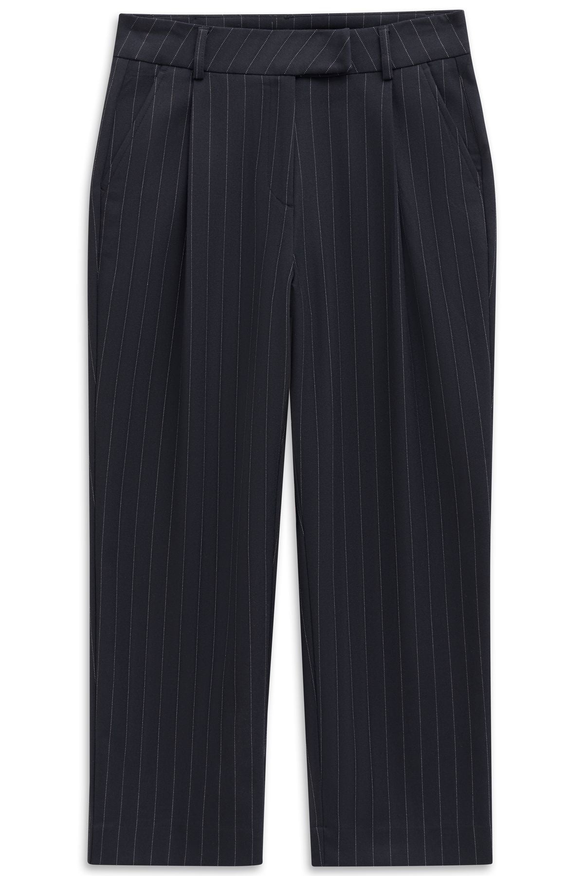 Leicht verkürzte Hosenform mit Nadelstreifen und Bundfalte aus einer elastischen Viskosequalität. Passend dazu gibt es eine Bluse aus dem gleichen Material. Farbe