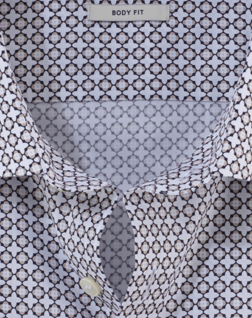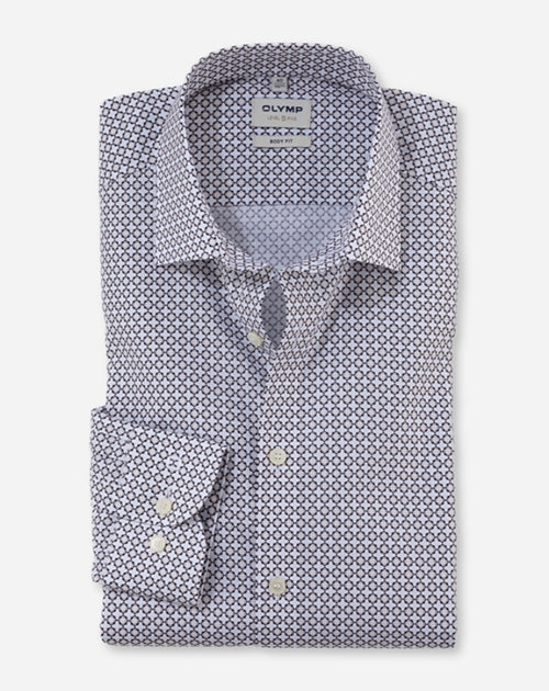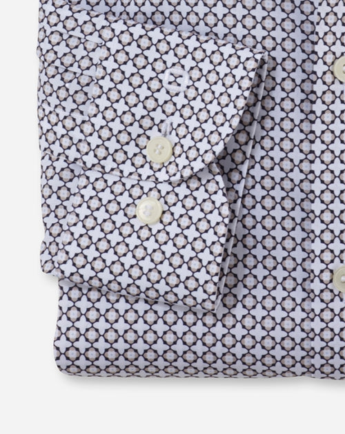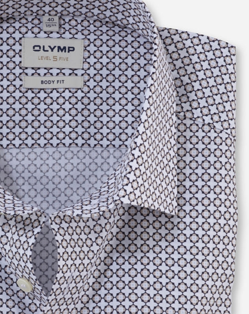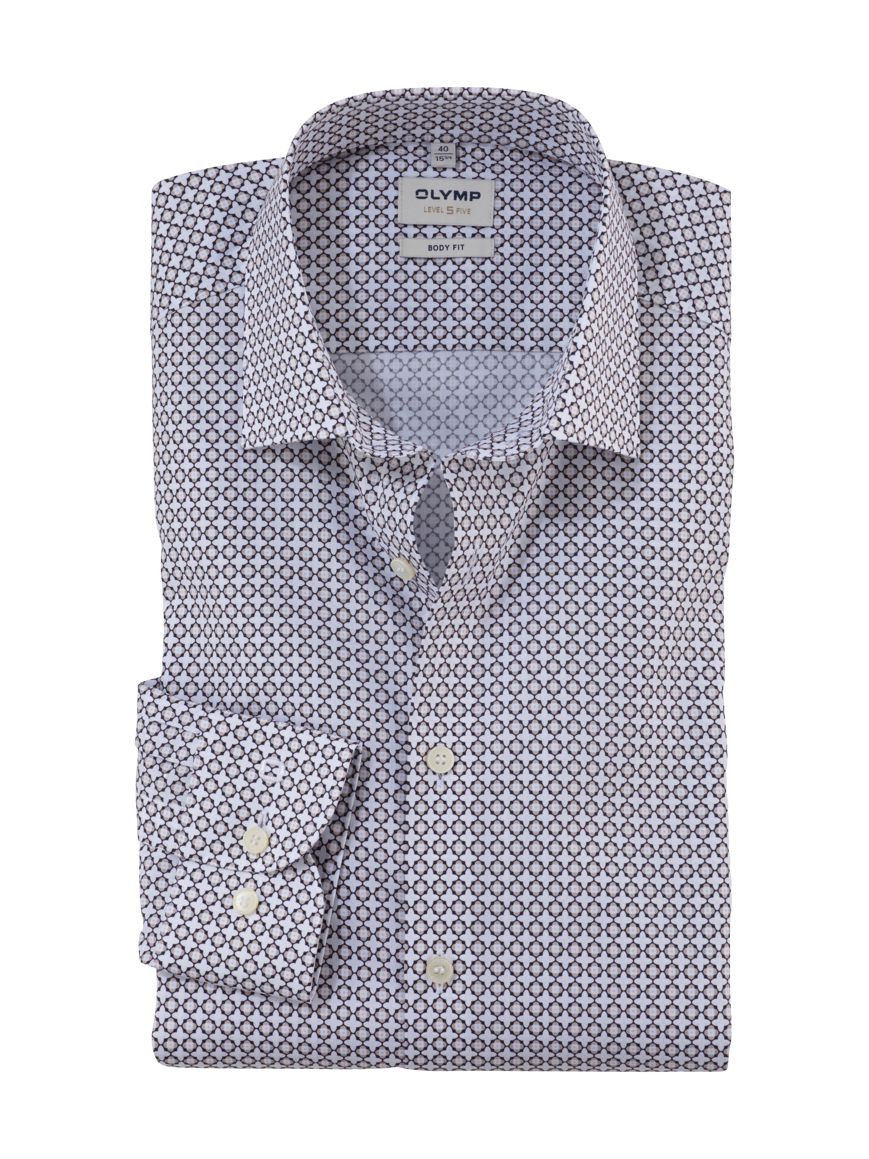 Smarter Musterunterbrecher mit grafischem Blüten-Print in Natur. Die junge Business-Linie OLYMP Level Five präsentiert sich sportlich stilvoll. Feine Garne aus Baumwolle in Popeline-Webart sorgen für das coole Trageerlebnis. Die körperbetonte Silhouette wird mit dem modischen New York Kent vollendet. Pflege- und bügelleicht. Farbe
