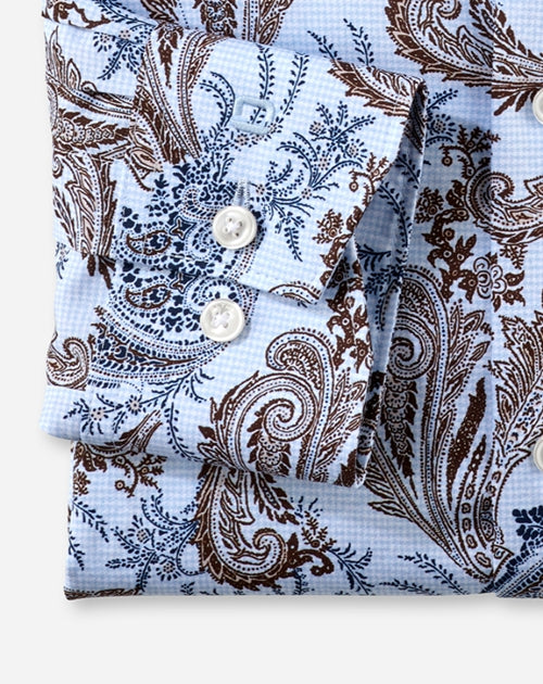 Ein florales Digitalprint-Allover setzt den modischen Eyecatcher zum Sakko. Der hervorragende Glättewert des hautsympathischen Popeline aus Baumwolle überzeugt durch die feinen Garnausspinnungen. Sportiver körpernaher Schnitt, weltoffener Global Kent, zeitsparend bügelfrei. Akzentuiert auf Bleu