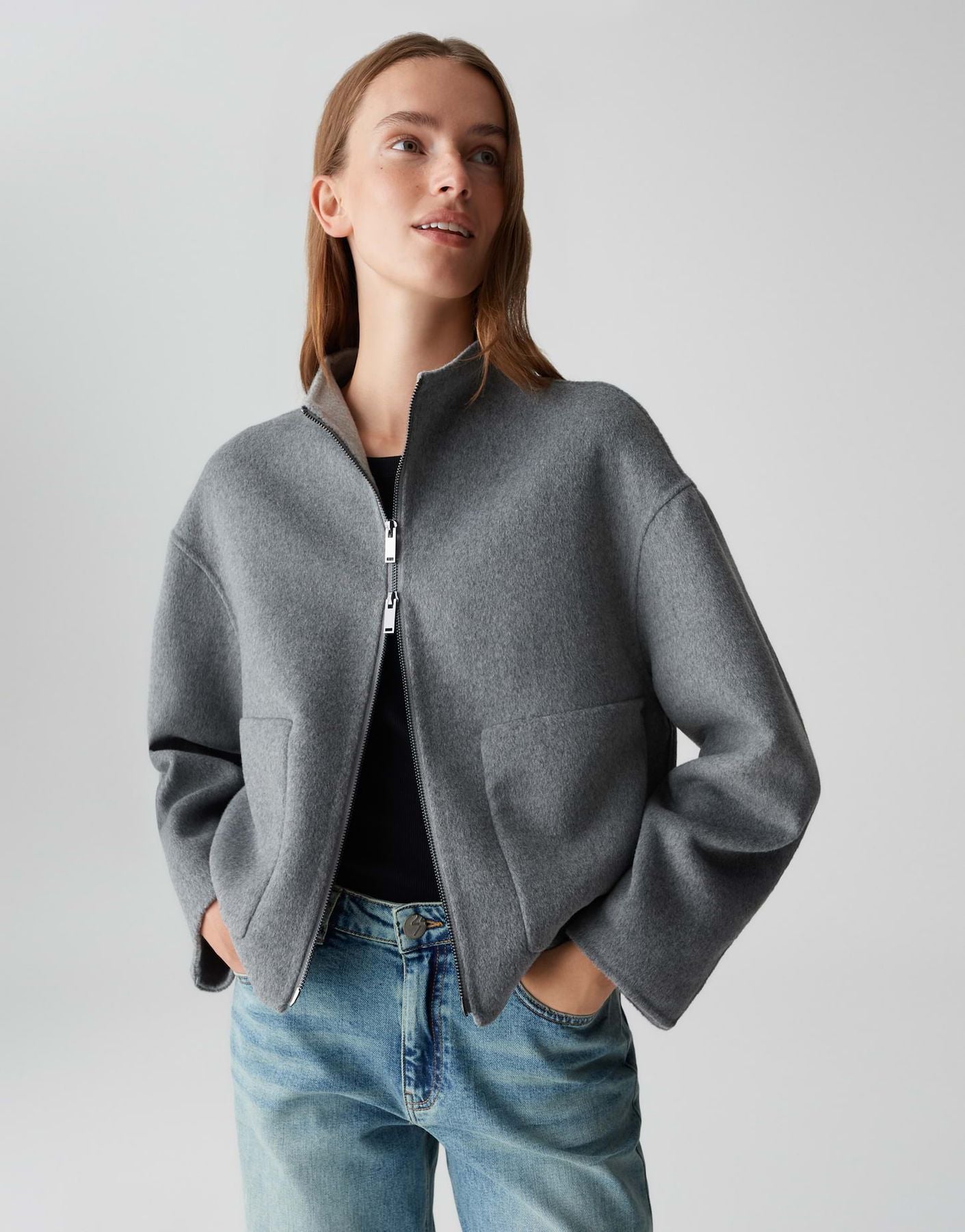 lockere Passform, gerader Schnitt, leicht verkürzt geschnitten, Langarm, kleiner Stehkragen, Rückenlänge ca. 61 cm bei Größe 36, Model Größe 177 cm – trägt Größe 36, Rückenbreite ca. 50 cm bei Größe 36, Webware, ungefüttert, natürlicher Griff, wärmender Stoff, Leicht wärmend, aufgesetzte Taschen vorne, Zwei-Wege-Reißverschluss