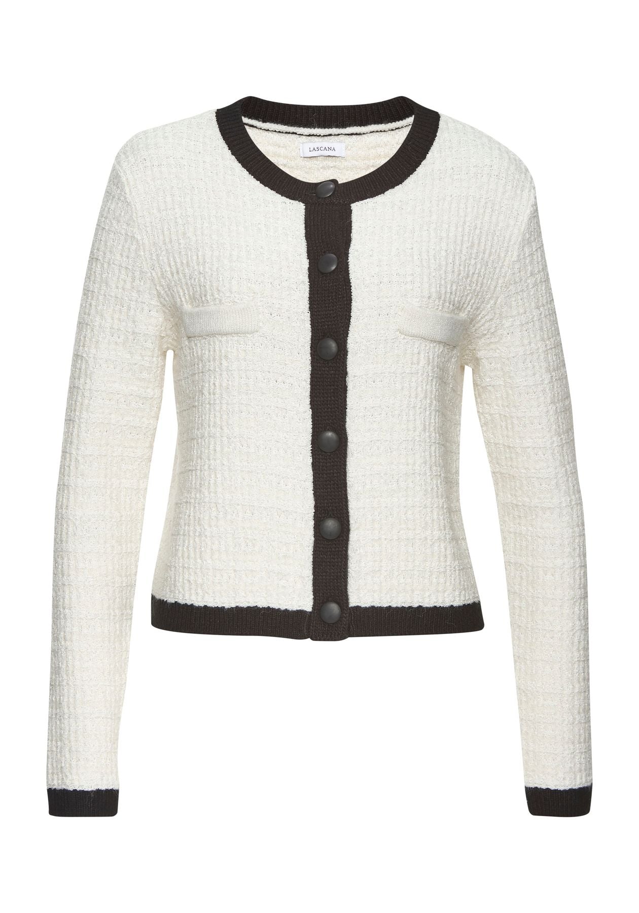 LASCANA Strickjacke von Lascana mit hoch geschlossenem Rundhals. Farblich abgesetzte Abschlüsse. Verschlussleiste mit Knöpfen in matter Optik. Mit Ziertaschen. Normale Passform. Pflegeleichte Strickqualität mit Baumwolle. Farbe