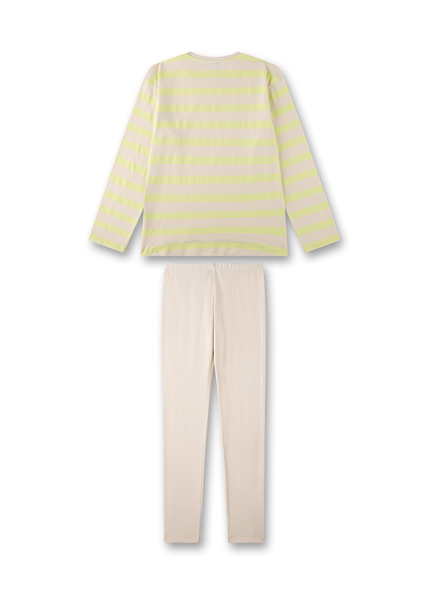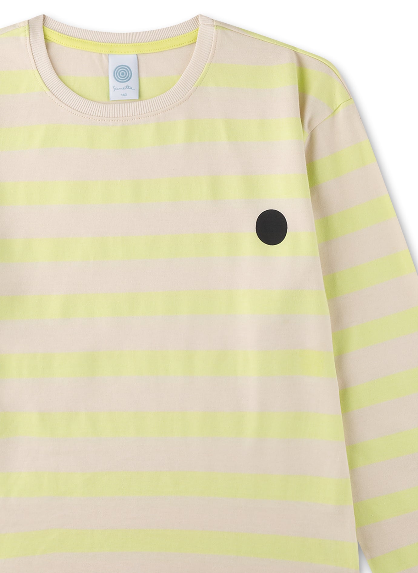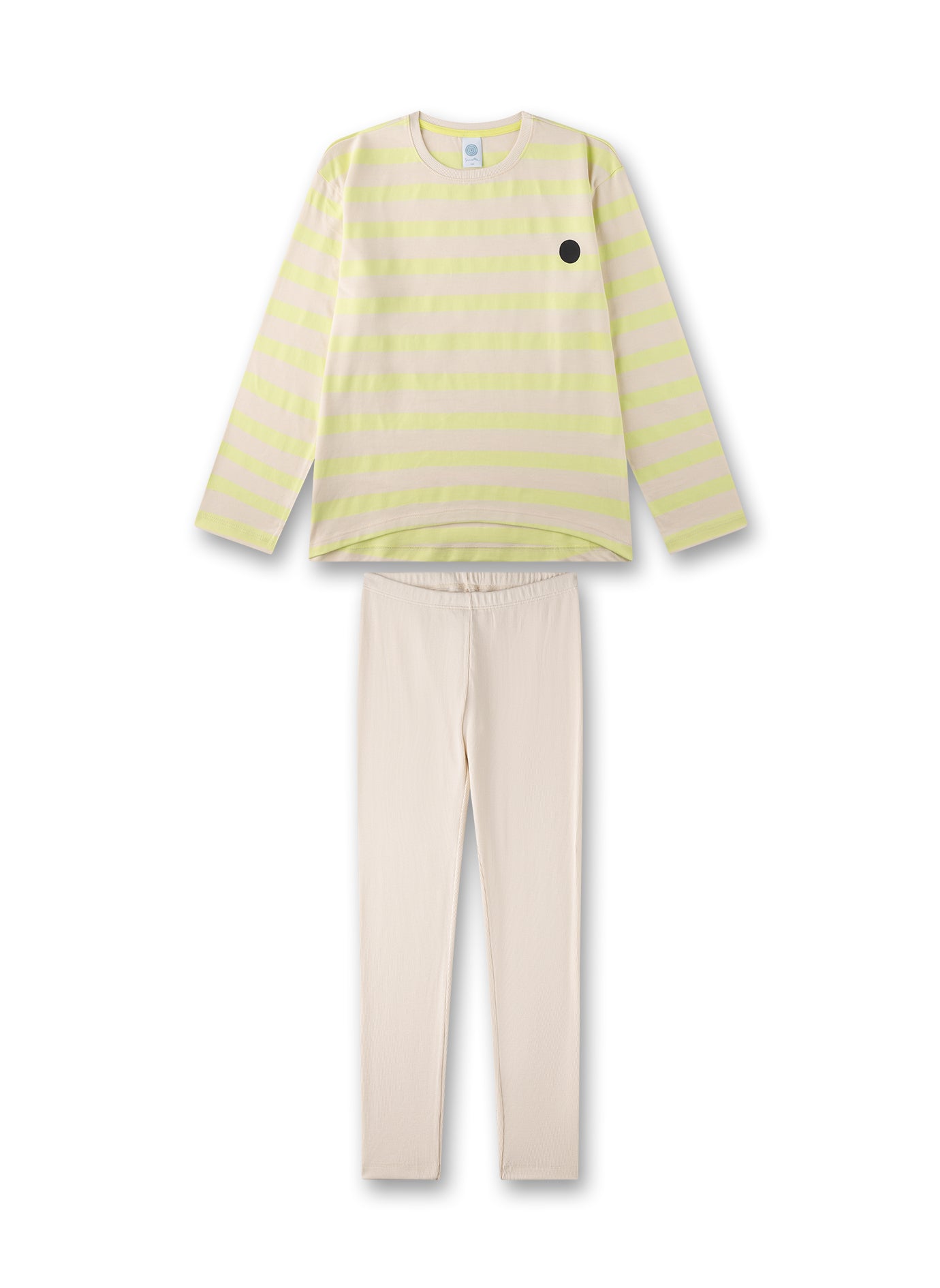 Lässiger Mädchen-Schlafanzug von Sanetta in einer coolen Farbkombination aus Neongelb und Beige mit einem ausdrucksstarken, schwarzen Punkt auf der linken Brustseite.