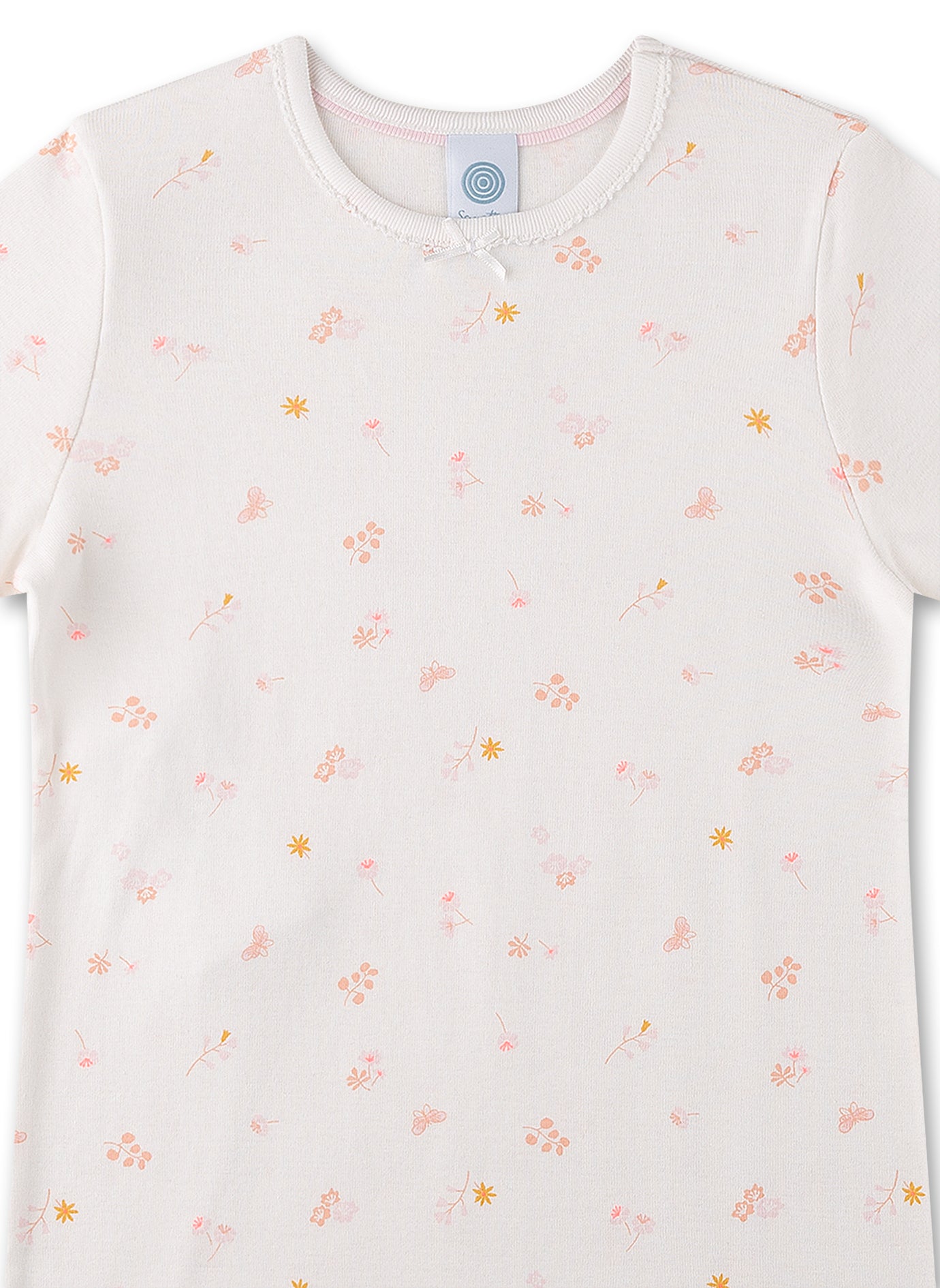 Romantisches Kurzarm-Nachthemd für Mädchen in Off-White mit einem schönen Blumen-Allover und hochwertiger Spitze am Halsausschnitt von Sanetta.