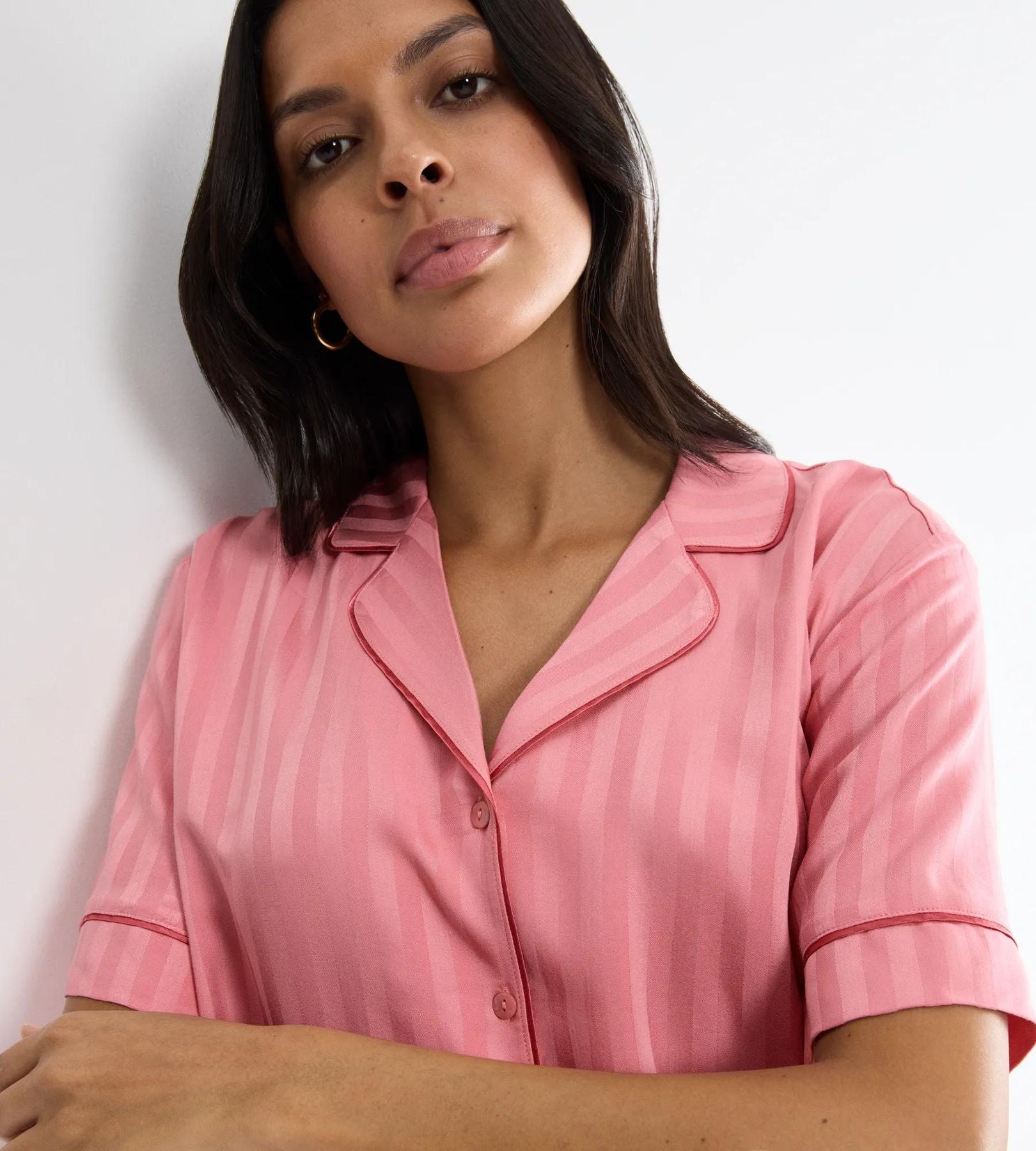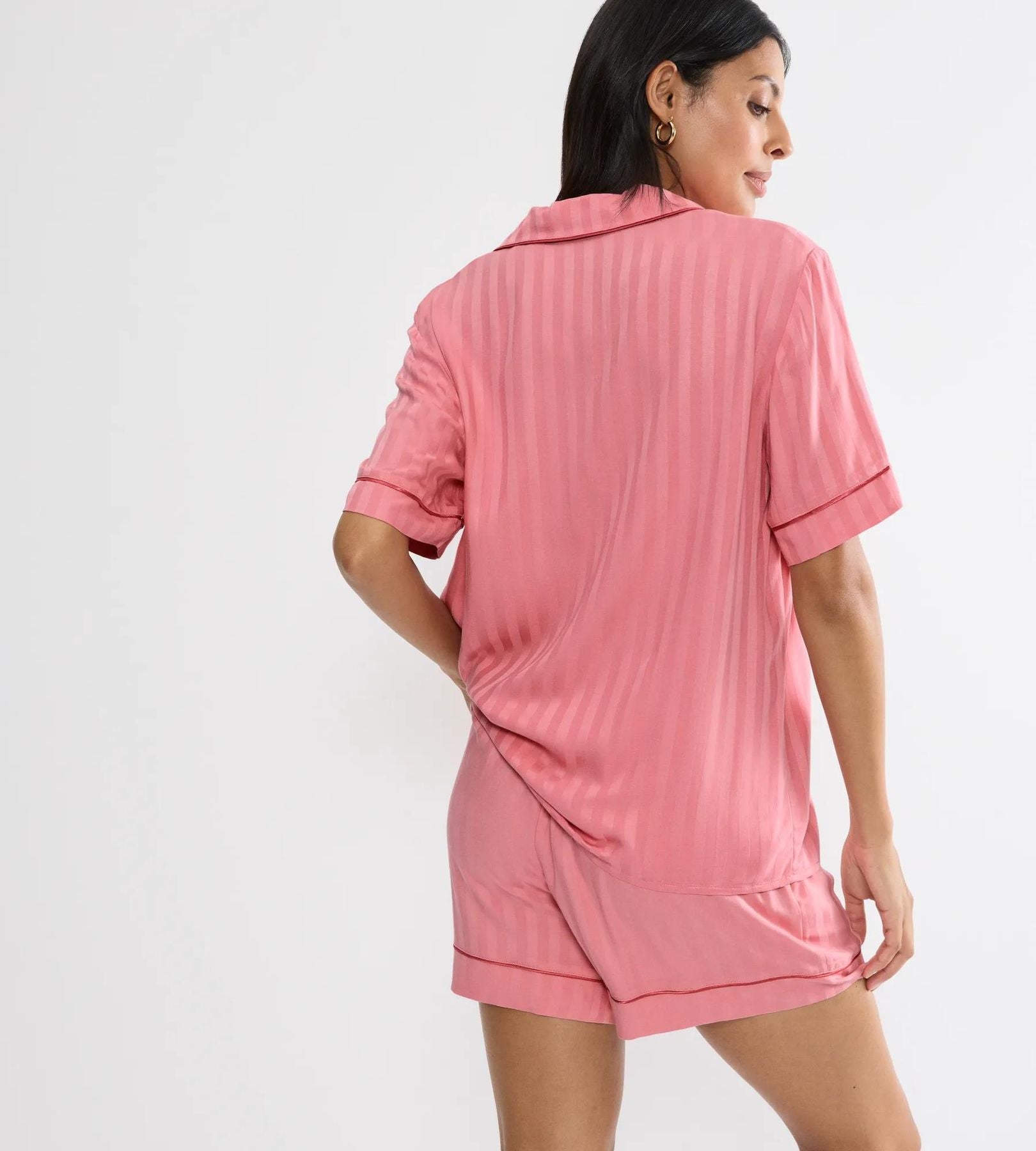 Dieses Shirt im Boyfriend-Stil mit Kragen und Knopfleiste vereint Komfort und Eleganz. Die dekorative Paspelierung verleiht dem gesamten Design einen Hauch von Raffinesse. Das Shirt besteht aus weichem, fließendem Stoff mit glänzend und matt gestreiftem Jacquard-Muster.