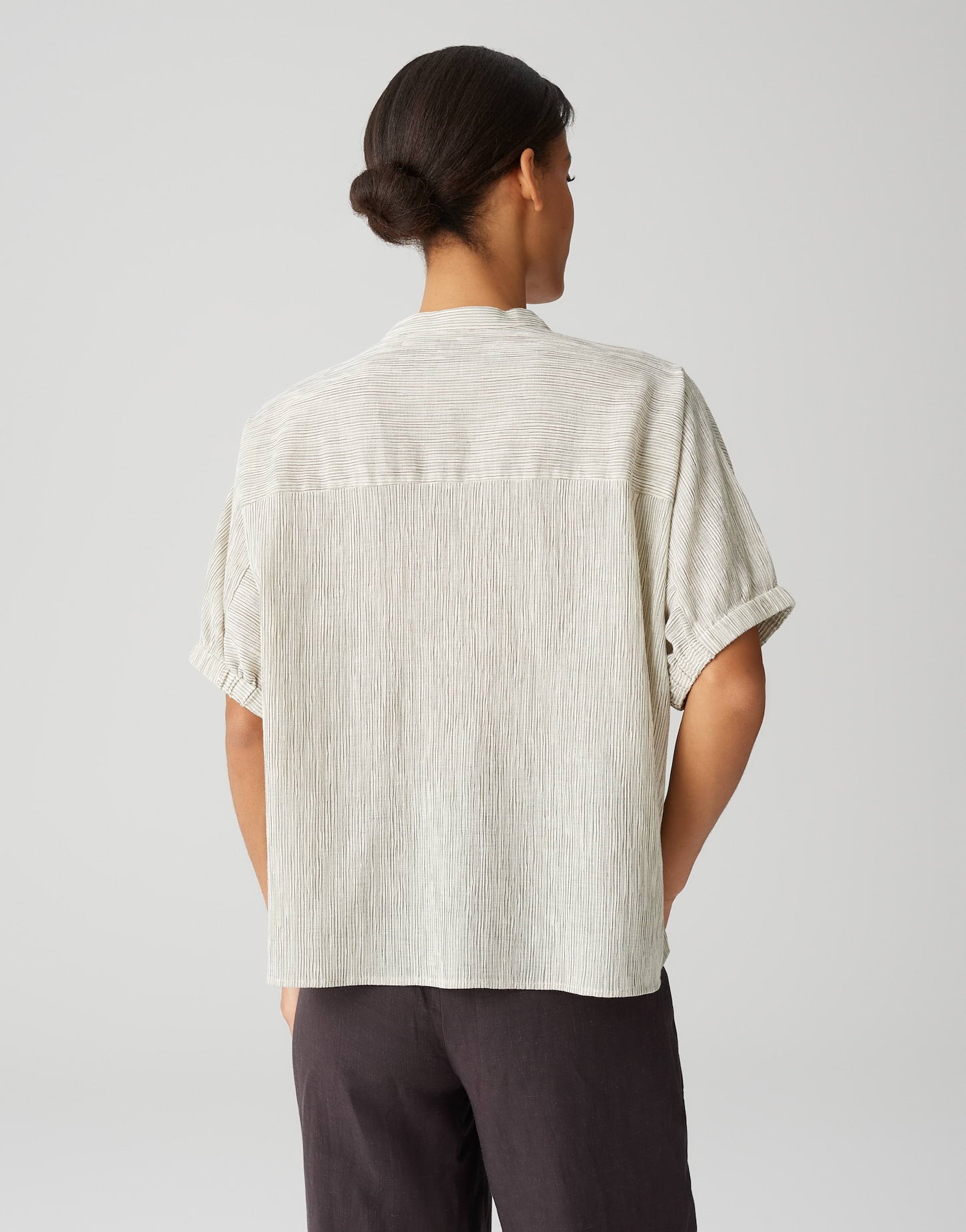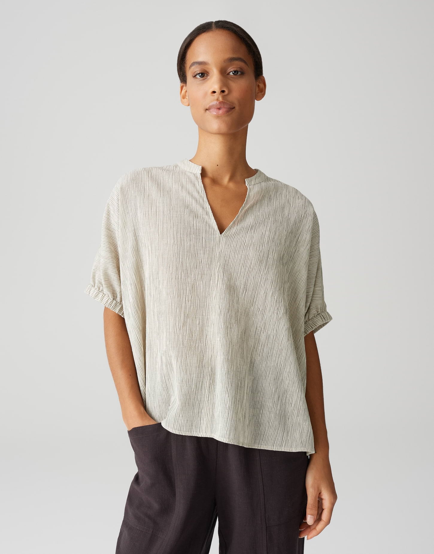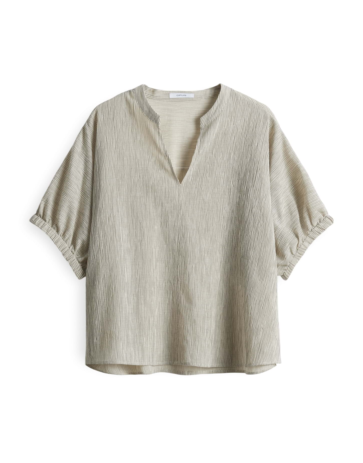 weite Passform, Boxy Silhouette, normale Länge, überschnittener Halbarm, Rundhals mit V-Auschnitt, Rückenlänge ca. 59 cm bei Größe 36, Model Größe 175 cm – trägt Größe 36, Webware, Crash Optik, natürlicher Griff, weich fließender Fall, Streifenmuster, schmaler Gummibund am Ärmelsaum, kleine Schlitze in den Seiten, Passe im Rücken