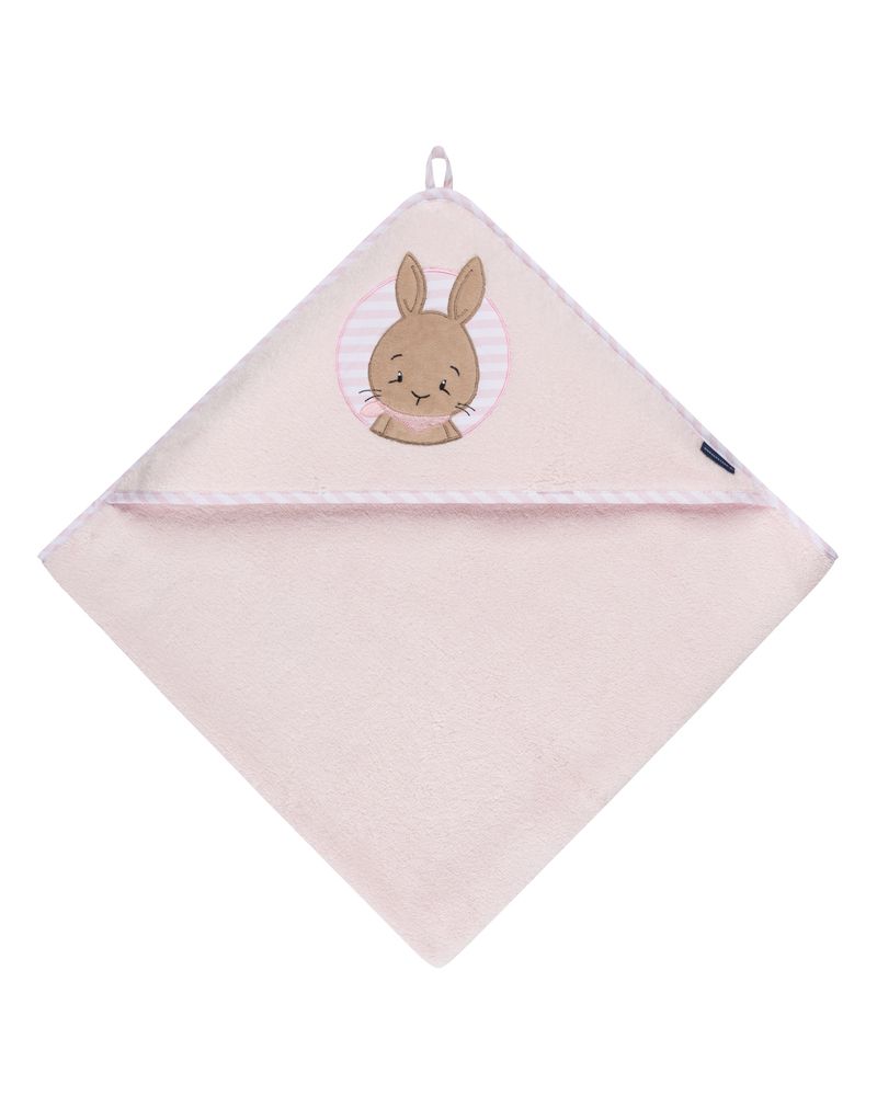 Hochwertiges Kapuzenlaken mit zauberhaften Hasen-Applikation auf der Kapuze. Weiche Luxus-Frottierware mit gestreifter Einfassung. Material: 100 % Luxus Baumwolle. Auf Schadstoffe geprüft: STANDARD 100 by OEKO-TEX®.
