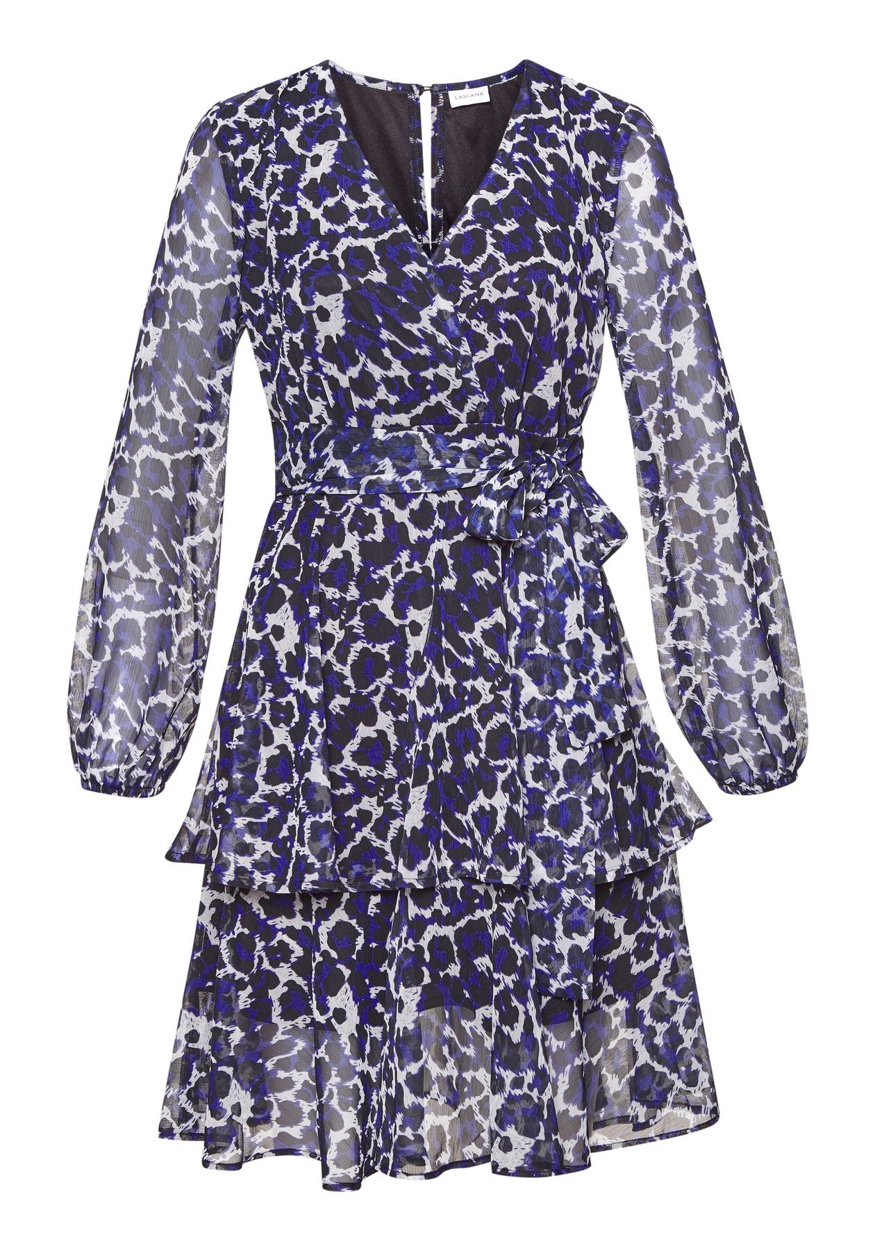 LASCANA Druckkleid von Lascana. Alloverprint. V-Ausschnitt mit Druckknopf. Lange, transparente Ärmel mit Gummizug. Mit fixiertem Bindeband. Aus leichter Chiffonware.