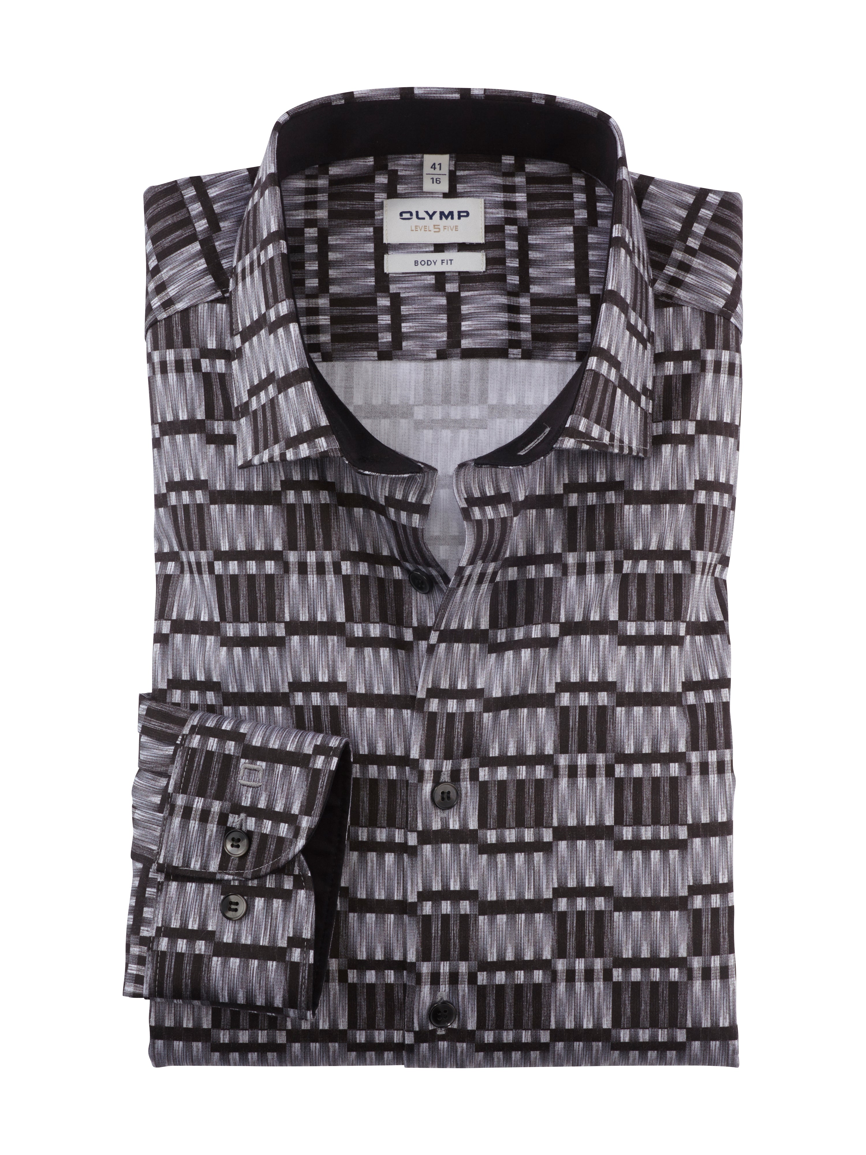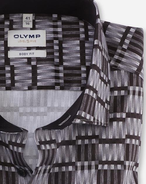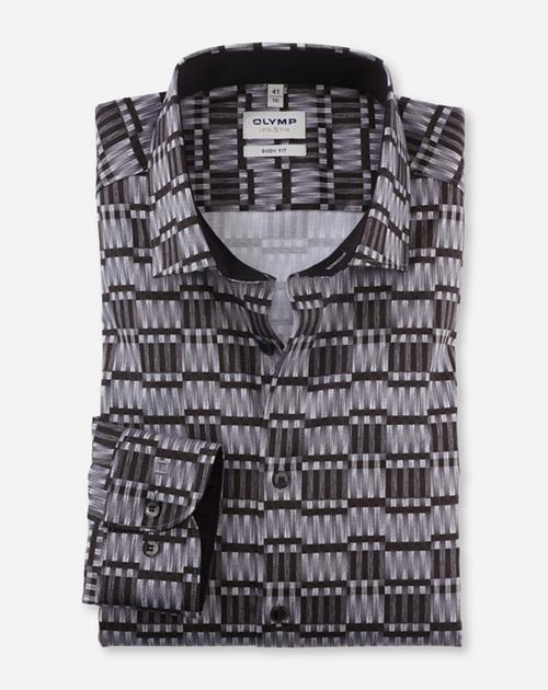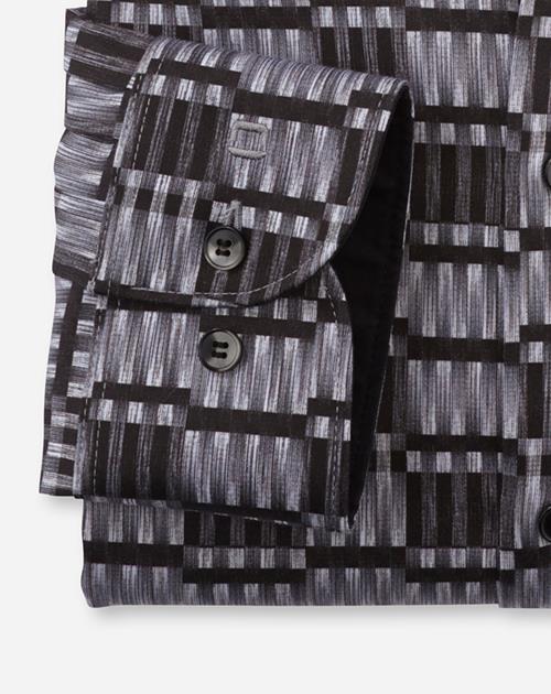 In kreativem Digital-Print mit raffinierten Graustufen präsentiert sich dieses schlank geschnittene OLYMP Level Five aus Satingwebe für modebewusste Businessmänner. Das dynamische Comfort-Stretch-Gewebe aus feinen Baumwollgarnen mit Elastolefinanteil sorgt für den formstabilen und agilen Look. Der sportlich-elegante Modern Kent matcht harmonisch zum körperbetonten Body Fit. Zeitsparende, pflege- und bügelleichte Qualität. Farbe